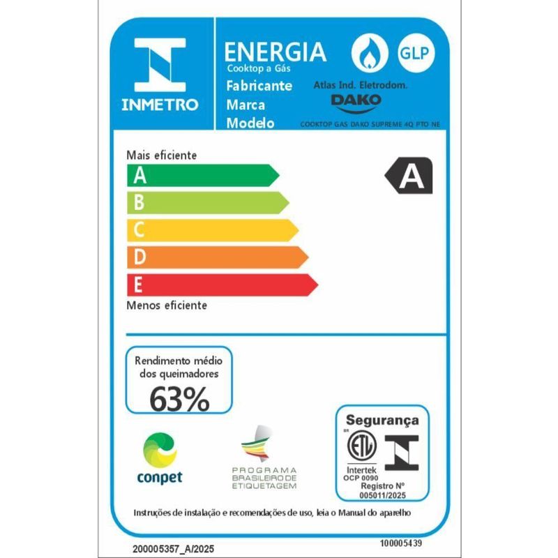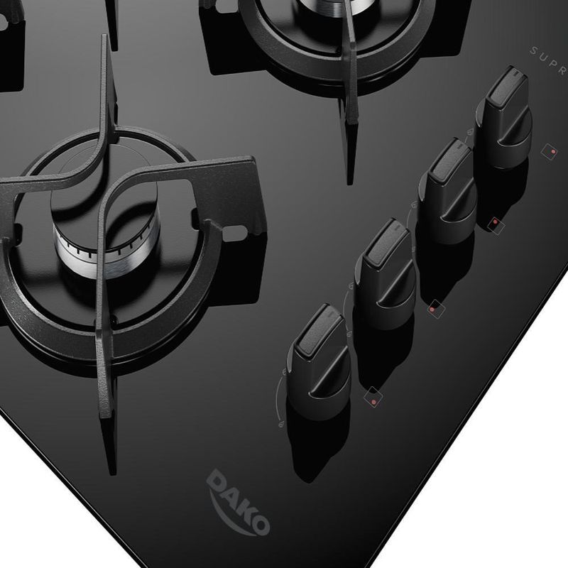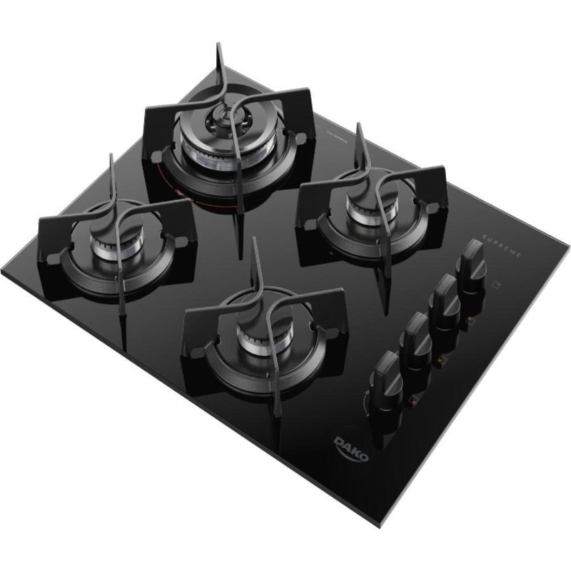 Cooktop 4 Bocas Dako Supreme Meas Vidro Preto A Gás Bivolt BivoltO Cooktop a gás Dako Supreme facilita o dia a dia e traz eficiência para quem gosta de cozinhar bem e rápido.Moderno, bonito e com detalhes que chamam atenção, as versões com 4 e 5 queimadores contam com Tripla Chama, que ajuda a preparar as receitas de forma mais rápida, com potência, estabilidade e segurança.As grades de ferro fundido com 4 pontos de apoio garantem firmeza para as panelas, deixando tudo mais estável. Já os queimadores selados impedem que a sujeira entre no interior, garantindo um melhor cozimento.A mesa de vidro temperado é fácil de limpar, assim como os botões removíveis, que tornam a manutenção do dia a dia ainda mais prática. E com o acendimento girou, acendeu, tudo fica mais prático.Se quiser, posso deixar tudo em uma única linha, simplificar ainda mais ou ajustar o estilo do texto — é só pedir!Atributos e Benefícios:Bonito e moderno: Facilita o dia a dia, com detalhes que chamam atenção.4 e 5 bocas com Tripla Chama: Mais rapidez para suas receitas.As panelas ficam firmes e seguras: Grades individuais de ferro fundido com 4 pontos de apoio.Vidro temperado: Resistente, seguro e fácil de limpar.Queimadores selados: Impede a sujeira, garantindo melhor cozimento.Botões removíveis: Fáceis de tirar e limpar.Acendimento “Girou Acendeu”: Simples, rápido e seguro.Ficha Técnica:Marca: DakoModelo: SupremeVoltagem: BivoltCor: PretoPainel: AnalógicoManípulos: PlásticoTipo da mesa: Vidro temperadoTipo de alimentação: Gás (GLP)Trempe: Individual com 4 pontos de apoi em Ferro FundidoAcendimento: Super AutomáticoQuantidade de bocas: 4Potência dos Queimadores: Semi-Rápido 3 x 1,65 kW, Tripla Chama 1 x 3,25 kWPotência total em (kW): 8,2Dimensões do Produto (largura x altura x profundidade) em cm: 58 x 12 x 46Dimensões do Produto embalado em cm (largura x altura x profundidade): 62,2 x 16,5 x 47,2Dimensões do Nicho em cm (largura x altura x profundidade): 51 x 20 x 34,5Tomada (A): 10APlug: Plugue 90° Tipo N 2P+T 3A/250VcaSKU: 300001964EAN: 7908853800217 Marca: Dako | Voltagem: Bivolt | Modelo: Supreme | Cor: Preto | EAN: 7908853800217 | SKU: 300001964 | Painel: Analógico | Tipo de Montagem: De Embutir | Manípulos: Plástico | Tipo da mesa: Vidro temperado | Tipo de alimentação: Gás | Tipo de gás: GLP | Trempe: Individual com 4 pontos de apoi em Ferro Fundido | Acendimento: Super Automático | Quantidade de bocas: 4 | Quantidade de queimadores elétricos: 4 | Potência dos Queimadores: Semi-Rápido 3 x 1,65 kW, Tripla Chama 1 x 3,25 kW | Potência total em (kW): 8,2 | Dimensões do Produto (largura x altura x profundidade) em cm: 58 x 12 x 46 | Dimensões do Produto embalado em cm (largura x altura x profundidade): 62,2 x 16,5 x 47,2 | Dimensões do Nicho em cm (largura x altura x profundidade): 51 x 20 x 34,5 | Tomada (A): 10A | Plug: Plugue 90° Tipo N 2P+T 3A/250Vca | Tipo de montagem: De embutir | Voltagem: Bivolt