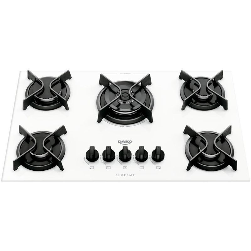 Cooktop 5 Boca Dako Supreme A Gás Branco Bivolt Cooktop 5 Bocas Dako Supreme a Gás Branco Bivolt – Design moderno e performance superiorO Cooktop Supreme a gás é ideal para quem ama cozinhar e impressionar, combinando design moderno e potência. Com uma mesa de vidro branco resistente e fácil de limpar, suas grades de ferro fundido oferecem estabilidade e segurança no uso diário.O sistema “Girou, acendeu” garante acendimento rápido da Mega e Tripla Chama, otimizando o tempo de preparo. Os botões removíveis facilitam a limpeza, enquanto os queimadores selados evitam a entrada de resíduos, mantendo seu cooktop sempre impecável.Para uma experiência de cozinha excepcional, escolha o Cooktop Supreme!Destaques- Design moderno e renovado- Vidro temperado, ultra resistente e fácil de limpar- 5 queimadores com Tripla Chama – mais velocidade no preparo das receitas- Grades individuais de ferro fundido – muito estáveis e robustas- Queimadores selados – impedem a entrada de sujeiras- Botões removíveis – limpeza prática e completa- Acendimento super automático “Girou, acendeu” – muito prático de usarAtenção: Não vendemos para CNPJ neste canal de vendas. Compras realizadas com CNPJ serão automaticamente canceladas.Componentes inclusos- Vidro temperado- Grades individuais de ferro fundido- Queimadores selados- Botões removíveis- Acendimento super automáticoEspecificações TécnicasMarca: DakoModelo: SupremeVoltagem: Bivolt (110/220V)Cor: BrancoQuantidade de bocas: 5Tipo de acendimento: SuperautomáticoFuncionamento: GásAcabamento da mesa: Vidro temperadoTrempes: Individuais de ferro fundido com 4 pontos de apoioBotões removíveis: SimPainel: AnalógicoPlug tomada: Sim (Padrão 10A)Tipo de montagem: De embutirEficiência energética: AFabricação: Nacional1 queimador Dupla Chama: 3,25 kW1 queimador Mega Chama: 2,85 kW3 queimadores Semirrápidos: 1,65 kW cadaPotência total: 11,05 kWProduto (L x A x P): 73,5 x 12 x 46 cmNicho (L x A x P): 61,5 x 20 x 36 cmPeso com embalagem: 11,1 kgPeso sem embalagem: 10,3 kgGarantia: 12 Meses