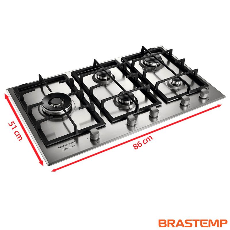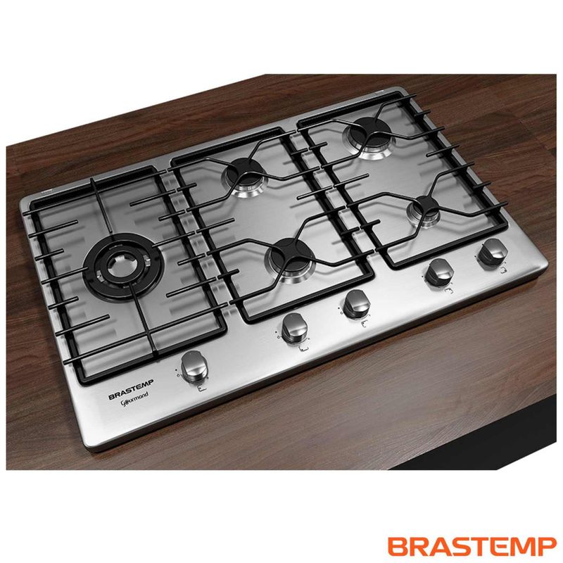 Cooktop à Gás de 5 Bocas Brastemp com Acendimento Superautomático Gourmand Inox - BDK90DRBNACooktop Inox 5 Bocas Brastemp Gourmand com queimador megachama na lateral, que facilita o preparo de receitas com panelas maiores e proporciona mais conforto ao cozinhar. Válvula de segurança. Acendimento superautomático. Destaques A Brastemp desenvolveu a linha Gourmand para levar o melhor cooktop para sua cozinha.O novo Cooktop Gourmand em aço inox é perfeito para boas aventuras gastronômicas ao lado de sua família e amigos.São 5 bocas com acendedor superautomático e três níveis de chama, sendo um queimador megachama de alta potência posicionado na lateral para maior conforto na hora de cozinhar. Outro destaque é a válvula de segurança que impede o vazamento de gás, caso alguma chama se apague.Cooktop Brastemp Gourmand. O melhor da Brastemp direto para sua cozinha.Mesa em inox com design exclusivoQueimador megachama de alta potência na lateral, maior conforto na hora de cozinharAcendimento superautomático: Basta girar o botão e o cooktop acendeSimmer ideal para preparos delicados CaracterísticasTipo: A gás Quantidade de Bocas: 5 BocasTipo de Acendimento: Acendimento superautomáticoBotões Removíveis Especificações TécnicasModelo: BDK90DRBNAAcabamento: InoxVálvula de Segurança Selo Conpet (Eficiência Energética): ECor: InoxVoltagem: 220VEAN: 7891129232891Garantia: 12 meses Dimensões e PesoDimensões do produto sem embalagem (AxLxP): 380x860510 mmDimensões do produto com embalagem (AxLxP): 195x945x595 mmDimensões do Nicho (AxLxP): 840x480x38 mmPeso do produto sem embalagem: 16,9 kgPeso do produto com embalagem: 18,3 kg Itens InclusosCooktop1 Manual Serviço de Instalação e Orientação de UsoPara sua comodidade, a Fast Shop dispõe do serviço de Instalação e Orientação de Uso*, com equipe especializada e autorizada pelo fabricante. Você pode contratar o serviço com o nosso canal Blá pelo WhatsApp no número (11) 3232-2949 ou em uma de nossas lojas. Consulte os valores e regiões atendidas.