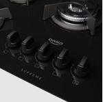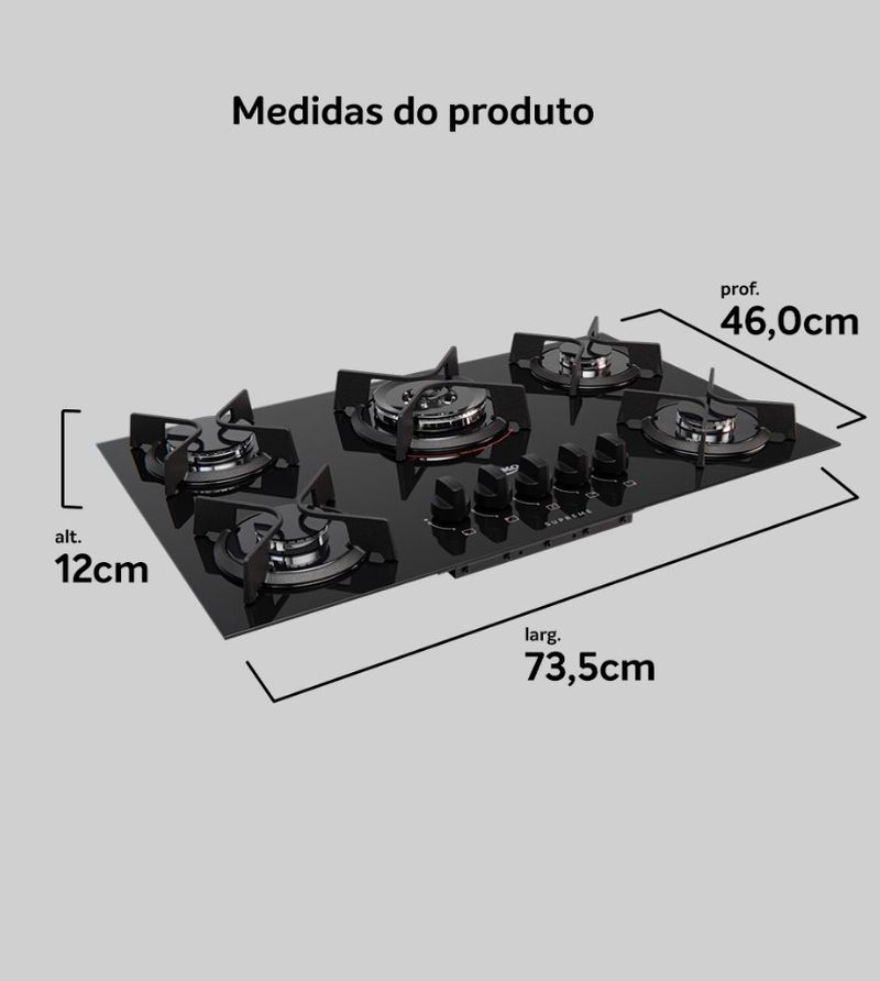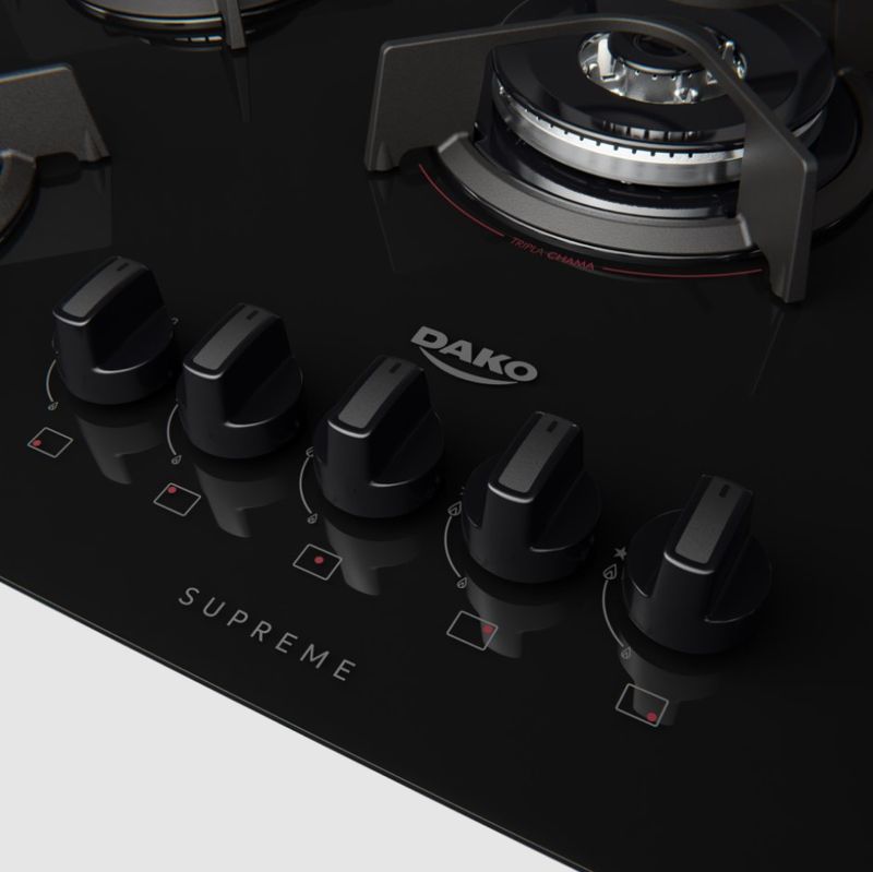 Cooktop 5 Bocas Preto com Mesa de Vidro e Tripla Chama Dako Supreme: mais que um cooktop, uma afirmação de bom gosto O Cooktop Supreme a gás foi desenvolvido para os amantes da cozinha que querem impressionar pessoas queridas, cozinhando diversas receitas, das mais simples as mais sofisticadas. O design encanta. Além de moderno, é potente. Sua mesa de vidro é linda, ultra resistente e muito prática de limpar. As grades de ferro fundido são robustas, com 4 pontos de apoio, proporcionando mais estabilidade e segurança para suas panelas, além de terem um visual incrível. “Girou, acendeu”: é assim que você acende as bocas, principalmente as Mega e Tripla Chamas, que aceleram o tempo de preparo do alimento, sobrando mais tempo para o que importa: família e amigos. Para garantir que o cooktop fique sempre com cara de novo, os botões são removíveis para uma limpeza completa e os queimadores são selados, impedindo a entrada de resíduos. A versão 5 bocas conta com 3 queimadores de 1,65 kW, 1 queimador Mega Chama de 2,85 kW, 1 queimador Tripla Chama de 3,25 kW e medidas 73,5 x 12 x 46 cm (largura x altura x profundidade). Cooktop 5 Bocas Preto com Mesa de Vidro e Tripla Chama Dako Supreme Bivolt Versão conta com 3 queimadores de 1,65 kW, 1 queimador Mega Chama de 2,85 kW, 1 queimador Tripla Chama de 3,25 kW e medidas 73,5 x 12 x 46 cm (largura x altura x profundidade). Mais informações Voltagem Bivolt Cor Preto Linha Supreme Quantidade de Bocas 5 bocas Tipo de Acendimento Superautomático Garantia 12 Meses Acabamento da Mesa Vidro Temperado Funcionamento Gás Trempes Individual de ferro fundido com 4 pontos de apoio Botões Removíveis Sim Fabricação Nacional Potência dos Queimadores 3Q Ramal de 1,65 kW, 1Q Mega Chama de 2,85 kW e 1Q Tripla Chama de 3,25 kW Eficiência Energética A EAN 7897180509439