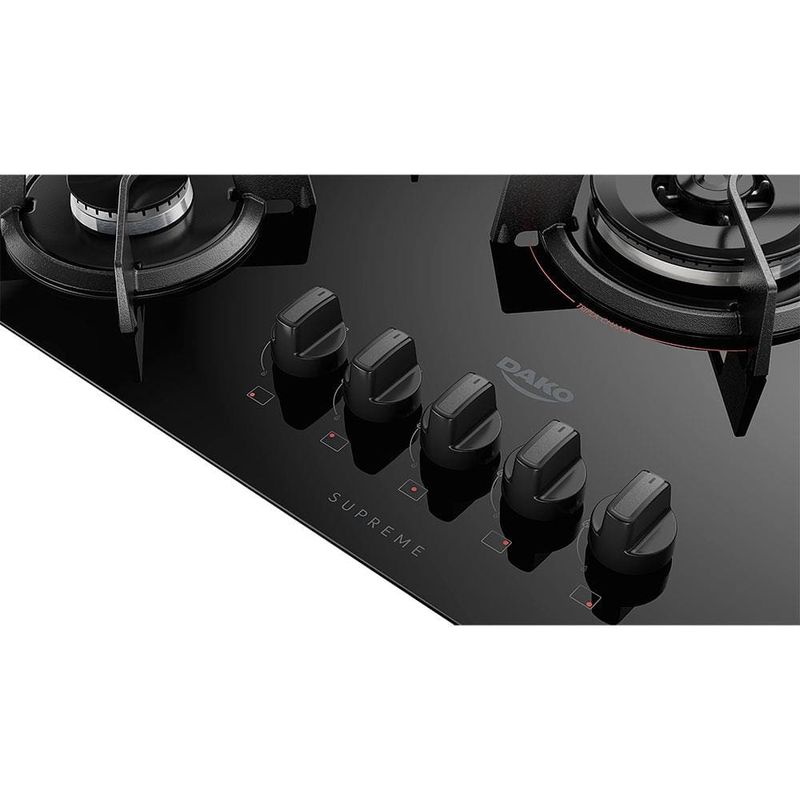 O Cooktop 5 Bocas Dako Supreme é a escolha ideal para quem deseja aliar sofisticação e eficiência na cozinha. Com um design moderno e elegante, ele transforma o ambiente em um espaço mais aconchegante e requintado.Sua mesa de vidro temperado não é apenas bela, mas também extremamente resistente e fácil de limpar. As grades de ferro fundido com 4 pontos de apoio garantem estabilidade e segurança para suas panelas.O sistema "girou, acendeu" torna o uso do cooktop ainda mais prático e fácil, especialmente com a presença dos queimadores Tripla Chama e Mega Chama, que aceleram o tempo de cozimento dos alimentos. Com 3 queimadores de 1,65 kW, 1 Mega Chama de 2,85kW, e 1 Tripla Chama de 3,25 kW, o Cooktop Supreme da Dako oferece potência e desempenho excepcionais para suas receitas favoritas.Além disso, para facilitar ainda mais a limpeza, os botões removíveis e queimadores selados do Cooktop Supreme tornam a manutenção uma tarefa simples e rápida.A escolha perfeita para o seu lar. Uma afirmação de bom gosto e qualidade. Aproveite!