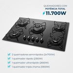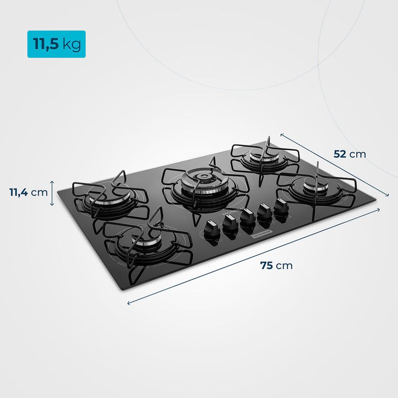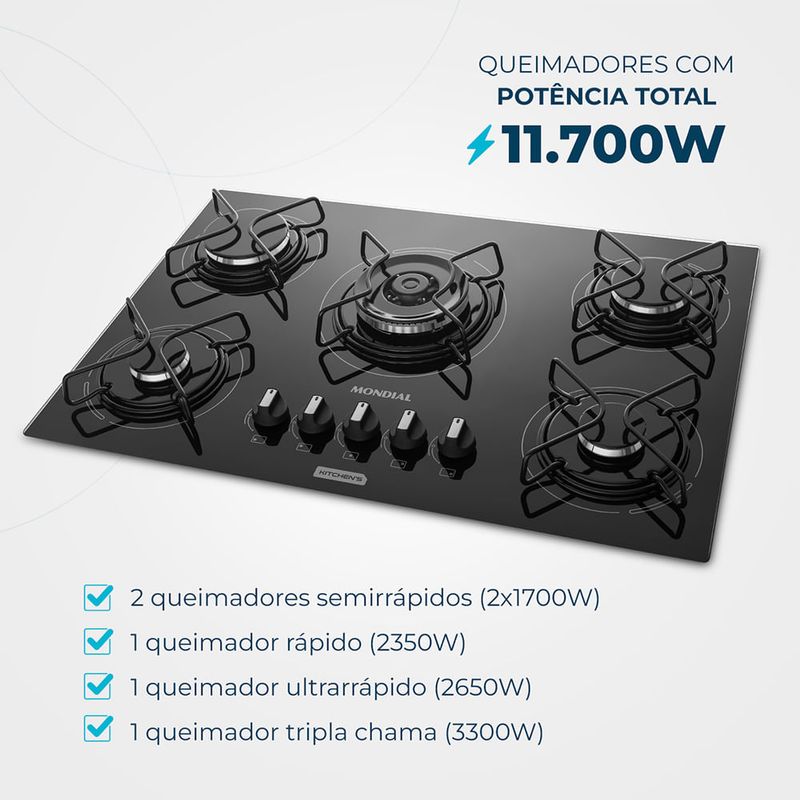 O Cooktop a Gás 5 Bocas Tripla Chama CTG-03 garante mais potência e rapidez no preparo dos alimentos. Possui mesa de vidro temperado, com melhor disposição e aproveitamento entre as bocas e 5 queimadores com potência total de 11.050W, sendo 1 queimador Tripla Chama. Os botões são removíveis, têm detalhamento em aço inox, e o acendimento das chamas é automático. Saiba mais sobre o CTG-03 da Mondial: DISTRIBUIÇÃO INTELIGENTE DAS BOCAS: Mesa maior, com melhor disposição e aproveitamento entre as bocas. Todas podem ser usadas ao mesmo tempo! POTÊNCIA TOTAL DE 11.700W: 1 queimador tripla chama (3300W) 1 queimador ultrarrápido (2650W) 1 queimador rápido (2350W) 2 queimadores semirrápidos (2x1700W) ACENDIMENTO AUTOMÁTICO: Agilidade e segurança para o dia a dia. Basta girar o botão que a chama acende. CONTROLE ENTRE AS CHAMAS: Registros com sistema By Pass que permitem melhor regulagem de chamas altas e baixas. MESA DE VIDRO TEMPERADO: Garante elegância ao ambiente, alta durabilidade e praticidade na limpeza. DESIGN MODERNO: Botões com detalhes em aço inox. BOTÕES REMOVÍVEIS: Os botões saem com facilidade, evitando o acúmulo de gordura e possibilitando uma limpeza mais eficaz. TREMPES ESMALTADAS INDIVIDUAIS: Grades mais resistentes, estáveis e fáceis de limpar. CONVERSÃO GRATUITA DE GÁS: Os Cooktops Mondial vêm de fábrica ajustados para funcionar com gás liquefeito de petróleo (GLP). A Mondial realiza, gratuitamente, a conversão do gás GLP para GN, uma vez e dentro do prazo de 90 dias, a partir da data de compra. UM ANO DE GARANTIA MONDIAL: A Mondial é a escolha de milhões de consumidores. Mondial, a escolha inteligente!