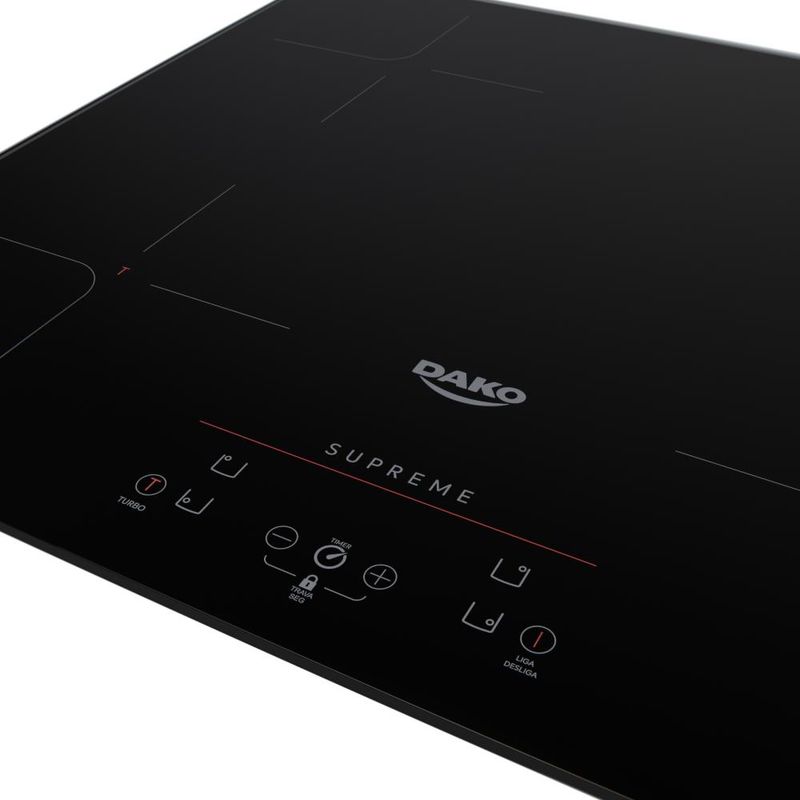 O Cooktop de Indução 4 Bocas Preto com Trava de Segurança Dako Supreme 220V cota com uma versão que possui 4 zonas de cocção com 1,5 kW e até 9 níveis de potência por zona, sendo turbo nas zonas dianteira esquerda e na traseira direta, chegando até 2 kW. Ficha Técnica: Voltagem: 220VTouch Screen: SimTrava de segurança: SimCor: PretoLinha: SupremeQuantidade de Bocas: 4 bocasTipo de Acendimento: InduçãoGarantia: 12 MesesAcabamento da Mesa: VitrocerâmicoFuncionamento: InduçãoDimensões do Produto (largura x altura x profundidade): 59 x 6 x 52 cmDimensões do Nicho (largura x altura x profundidade): 56 x 62 x 49 cmFabricação: ImportadoPotência dos Queimadores: 4 zonas de 1,5 kW, sendo 2 zonas com turbo para 2 kW (dianteira esquerda e traseira direita)Eficiência Energética: AEAN: 7897180509538 Não faturamos para CNPJ através desse canal. Realize sua compra através de um CPF.