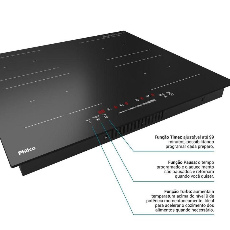 Cooktop De Indução Philco 4 Queimadores Turbo PCTQ1 220VO Cooktop de Indução Philco PCTQ1 Função Turbo, é o aparelho perfeito para quem busca elegância, potência e segurança, mas sem abrir mão de uma cozinha tecnológica e de última geração!Potente, conta com 9 níveis de potência e temperatura, mais versatilidade na escolha da temperatura ideal para o preparo de cada alimento. E, se for preciso acelerar o cozimento dos alimentos, possui a Função Turbo que aumenta a temperatura do nível 9 momentaneamente. Além disso, o aquecimento por indução do seu Cooktop Philco, aquece através de um campo eletromagnético criado entre a parte interna do cooktop e o fundo da panela, gerando calor diretamente na panela garantindo mais eficiência, segurança e praticidade. Tudo isso com um visual clean, moderno e intuitivo, pois conta com painel touch e display digital, de fácil programação e muito mais facilidade para acompanhar as configurações do Cooktop de Indução Philco. A Philco se preocupa com sua segurança e, por isso, o Cooktop possui sistema de segurança que, em caso de derramamento sobre o painel de controle, o aparelho desliga automaticamente. Cooktop de Indução Philco PCTQ1 Função Turbo, a opção moderna e segura para sua cozinha ficar ainda mais completa! Principais Características:- 9 níveis de Potência - Possui Timer, é possível programar o tempo de cozimento dos alimentos em até 99 minutos- Função Calor Turbo- Display Digital e Painel Touch- Reconhece panelas com fundo de material magnético- Queimador para recipientes de 12 a 21cm- Desligamento automático de segurança- Base em vidro cerâmico.Especificações Técnicas:Marca: PhilcoModelo: PCTQ1Cor: PretoTripla chama: NãoEstado: NovoQuantidade de bocas: 4Tipo de montagem: De sobreporAltura do produto: 6,1 cmLargura do produto: 59 cmComprimento do produto: 52 cmPeso do produto: 7,78 kgAltura com embalagem: 14 cmLargura com embalagem: 66 cmComprimento com embalagem: 59 cmPeso com embalagem: 9,4 kgGarantia (Dias): 360Observação: Somente faturamos para o nosso consumidor final, ou seja, não faturamos pedidos para CNPJ por este portal de vendas;