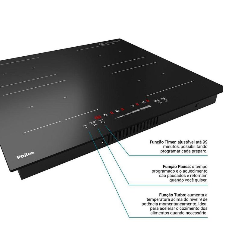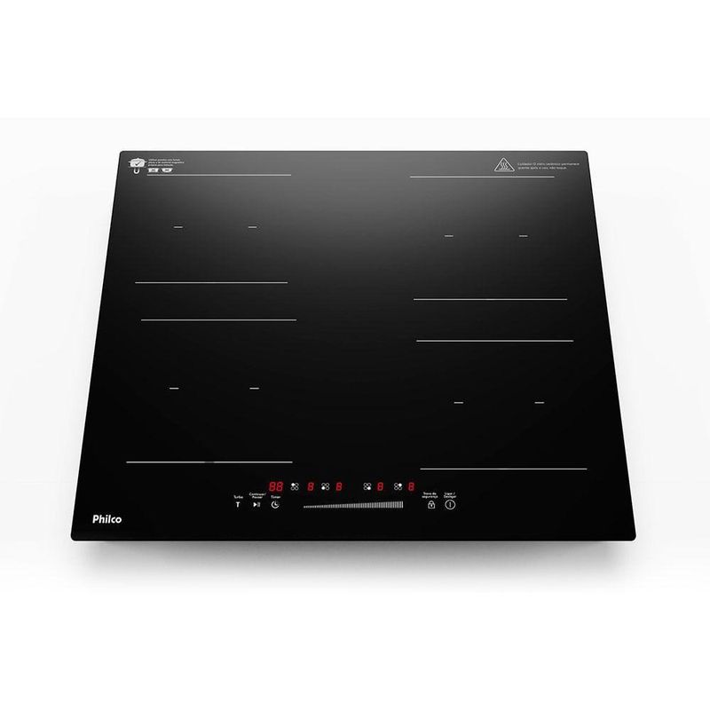 Cooktop De Indução Philco PCTQ1 4 Bocas Função Turbo Display Digital Painel Touch Preto 220VCooktop De Indução Philco PCTQ1 4 Bocas Função Turbo Display Digital Painel Touch Preto 220vTransforme sua experiência na cozinha com o Cooktop de Indução Philco PCTQ1. Com 4 bocas independentes, painel touch digital e função turbo, ele oferece velocidade, precisão e no preparo das suas receitas favoritas.O modelo é perfeito para quem busca um visual moderno, com tampo em vidro cerâmico preto, fácil de limpar e resistente. E como funciona por indução, ele aquece apenas a panela, trazendo muito mais eficiência e no uso diário.O Cooktop de Indução Philco PCTQ1 Função Turbo, é o aparelho perfeito para quem busca elegância, potência e , mas sem abrir mão de uma cozinha tecnológica e de última geração!Potente, conta com 9 níveis de potência e temperatura, mais versatilidade na escolha da temperatura ideal para o preparo de cada alimento. E, se for preciso acelerar o cozimento dos alimentos, possui a Função Turbo que aumenta a temperatura do nível 9 momentaneamente.Além disso, o aquecimento por indução do seu Cooktop Philco, aquece através de um campo eletromagnético criado entre a parte interna do cooktop e o fundo da panela, gerando calor diretamente na panela garantindo mais eficiência, e praticidade.Tudo isso com um visual clean, moderno e intuitivo, pois conta com painel touch e display digital, de fácil programação e muito mais facilidade para acompanhar as configurações do Cooktop de Indução Philco.A Philco se preocupa com sua e, por isso, o Cooktop possui sistema de que, em caso de derramamento sobre o painel de controle, o aparelho desliga automaticamente.Cooktop de Indução Philco PCTQ1 Função Turbo, a opção moderna e segura para sua cozinha ficar ainda mais completa!- Aquecimento por indução: Aquece através, de um campo eletromagnético criado entre a parte interna do cooktop e o fundo da panela, gerando calor diretamente na panelagarantindo mais eficiência, e praticidade- Sistema de proteção: Proteção contra derramamento, o aparelho, desliga automaticamente em caso de derramamento sobre o painel de controle.- Função Calor Turbo - Aumenta a temperatura acima, do nível 9 de potência momentaneamente. Ideal para acelerar o cozimento dos alimentos quando necessário.- Painel touch e display digital - Com um visual clean, moderno e intuitivo é muito mais fácil programar e acompanhar as configurações do cooktop.- 9 níveis de potência e temperatura - Mais versatilidade na escolha da temperatura ideal para o preparo de cada alimento.- Possui Timer, é possível programar o tempo de cozimento dos alimentos em até 99 minutos.- Reconhece panelas com fundo de material magnético.- Queimador para recipientes de 12cm a 21cm.- Desligamento automático de .- Base em vidro cerâmico.- 4 funções - Turbo / pausa / trava de painel / timer.- 4 queimadores - Com 2 tamanhos diferentes- Informações Fornecidas Pelo Fabricante.Marca: PhilcoCódigo Modelo: PCTQ1Voltagem: 220vQuantidade de Bocas: 4Cor: PretoQuantidade de queimadores: 4Garantia do fornecedor: SimFunção Turbo: SimAltura (cm): 6,1Largura (cm): 59Profundidade (cm): 52Garantia: 12 Meses