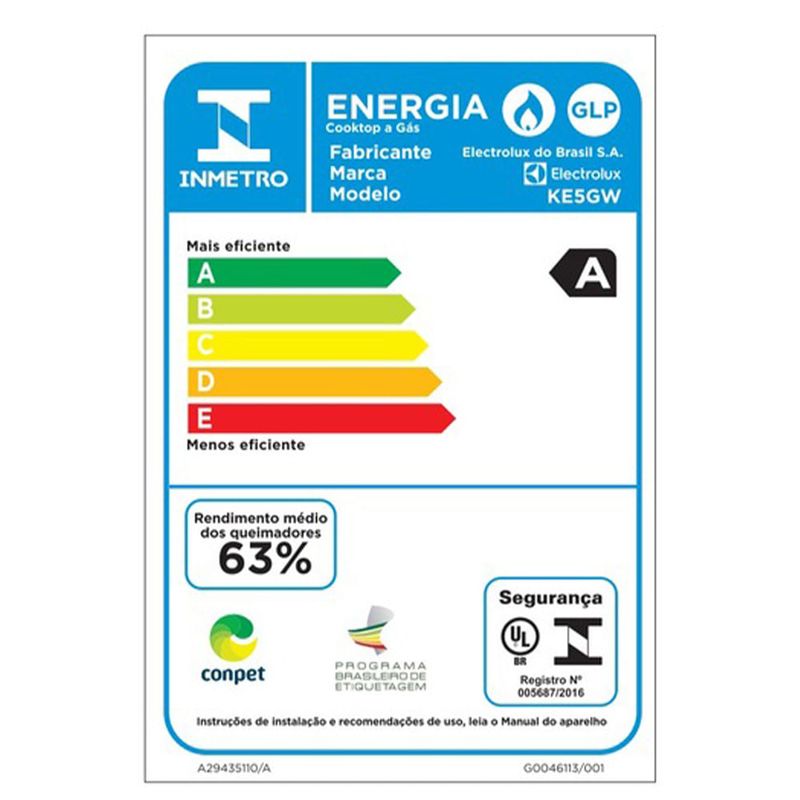 O Cooktop 5 Bocas Electrolux Gás Expert Mesa de Vidro, Chama Precisa e Grade de Ferro Fundido (KE5GW) oferece o melhor da alta tecnologia para que você explore novas possibilidades na cozinha. Tenha mais precisão na temperatura para o preparo de diferentes receitas. A Tecnologia ChamaPrecisa oferece 6 níveis pré-programados de potência1, conferindo sabor e textura ideais aos seus pratos. Confira os níveis: 1 - Derreter e Manter Aquecido; 2 - Preparos em panela de pressão e Banho-Maria; 3 - Preparar Molhos; 4 - Refogar; 5 - Grelhar e Fritar; e 6 - Ferver. O Cooktop 5 Bocas Electrolux Gás Expert conta com um Queimador Multi Chama Deslocado. Graças aos seus 6 apoios e a sua posição afastada dos demais, ele é ideal para panelas maiores e deixa mais espaço para o uso simultâneo de outras bocas ou panelas de diferentes tamanhos. Esse poderoso queimador distribui o calor de maneira uniforme e permite cozinhar com 20%2 mais eficiência, além de ferver a água 22%3 mais rápido. As Grades Individuais de Ferro Fundido com 4 apoios proporcionam aderência perfeita ao fundo das panelas. São 4x mais estáveis4, garantindo alta qualidade, segurança e durabilidade no uso diário. O Cooktop 5 Bocas Electrolux Gás Expert é um aliado inovador, de alta capacidade, precisão e elegância. Os Queimadores Selados dão maior estabilidade às chamas, evitando que o fogo se apague. A potência total de 12.700 W dos queimadores garante um cozimento rápido e eficiente, que acelera seus preparos. Leve design e tecnologia de ponta para sua cozinha. A mesa de vidro temperado assegura uma escolha sofisticada ao mesmo tempo que proporciona uma limpeza sem esforço. Materiais e acabamentos resistentes conferem alta durabilidade e robustez ao produto. Conte com mais facilidades para poder focar no que importa: cozinhar. Com o Acendimento Automático Super Rápido, é possível ligar a chama com apenas um giro do botão. E os botões removíveis podem ser facilmente removidos para uma limpeza prática e completa. Seu desempenho classe A no consumo de energia (Inmetro) é ideal para preparar refeições com eficiência e economia. Amplie sua experiência com os acessórios e consumíveis da Electrolux e tenha uma cozinha mais completa, bonita e bem equipada. CaracterísticasTipo: Cooktop a GásQuantidade de Bocas: 05Tipo de Acendimento: Super AutomáticoTipo de Queimadores: SeladosPainel: ManualMesa sem FuraçãoNíveis de Potência: 06 Especificações TécnicasModelo: KE5GWAcabamento: Mesa em Vidro TemperadoSelo Conpet (Eficiência Energética): AConsumo de Energia: 110 kWh/mês (110V) / 100 kWh/mês (220V)Tipo de Gás: GLP ou GNPotência: 12WCor: Preto e InoxVoltagem: BivoltEAN: 7909569484715Garantia: 12 meses Dimensões e PesoDimensões do produto sem embalagem (AxLxP): 131x800x450 mmDimensões do produto com embalagem (AxLxP): 159x895x490 mmDimensões do Nicho (AxLxP): 390x760x150 mmPeso do produto sem embalagem: 12,50 KgPeso do produto com embalagem: 14,50 Itens Inclusos01 Cooktop