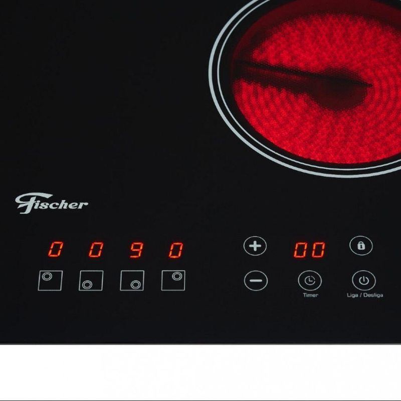 Cooktop Elétrico 4 Bocas Mesa Vitrocerâmica Touch Fischer Preto 220vO Fogao Cooktop Fischer Eletrico conta com controle touch screen (sensivel ao toque), mesa vitroceramica, quatro queimadores eletricos, trava de seguranca e 9 niveis de potencia. Possui ainda sistema indicador de superficie quente, oferecendo seguranca, grande eficiencia, precisao e comodidade.Caracteristicas: Display digital Painel touch screen Timer de 1 ate 99 minutos Facil limpeza Potencia Total 6000W Frequencia 60 Hz Dimensoes do nicho de instalacao (LxP): 56 x 49cm Portaria Inmetro 148/2022 Dimensoes: Altura: 5,5 cm Largura: 58 cm Profundidade: 51 cm Peso: 7,50 kg Garantia do fornecedor de 12 meses.