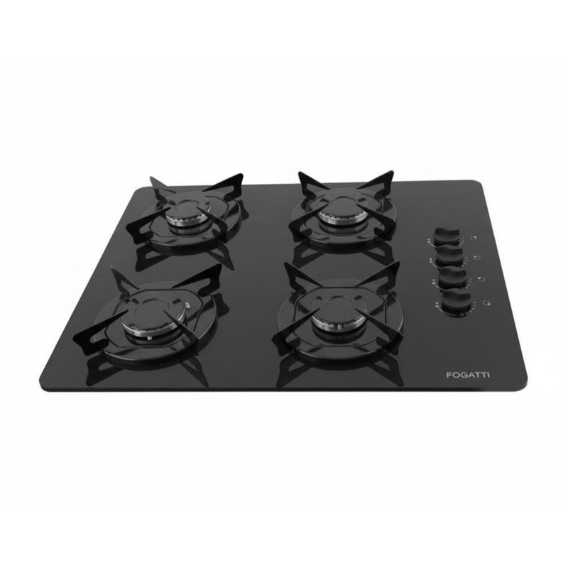 Cooktop Fogatti à Gás Fgt 4b Vidro Preto Flange Esmaltada Preto BivoltOs cooktops da Fogatti sao perfeitos para sua cozinha. Com mesa de vidro temperado, possui um queimador grande e tres medios, com acendedores inteligentes, que acendem ao girar os botoes. As trempes, grades possuem o exclusivo Sistema Anti rotacao, um sistema que impede que as grades girem ou trepidem, proporcionando muito mais seguranca e praticidade para sua familia. Alem de tudo, possui design diferenciado e e facil de limpar, com botoes removiveis para limpeza. O selo CONPET A certifica o consumo eficiente de energia e possui tambem opcoes de cores diferenciadas.Cooktop, Fogao de mesa de Embutir Caracteristicas Bivolt, serve tanto para 110V quanto para 220V 1 Queimador Rapido, grande 3 Queimadores Semi rapidos, medios Mesa de Vidro temperado de 6 mm Acendedores de Seletor Automatico Inteligente, acendem ao pressionar e girar o botao Trempes, grades em Aco esmaltado, removiveis e lavaveis Sistema de combustao Italiano Exclusivo pino anti-rotacao nas trempes, grades Botoes removiveis para limpeza Flanges Esmaltado Certificacao Conpet A Facil limpeza e design moderno Acompanha vedacao da base Especificacoes Tecnicas Tensao Bivolt Frequencia 60Hz Consumo 0,142 kWh Potencia 6,3 W para tomada em 127 V e 10,5 W para tomada em 220V 1 Queimador rapido, grande 3000W 3 Queimadores semi rapidos, medios 1750W cada Pressao do Gas 28 a 37 mBar Tipo Gas GLP botijao, nao serve para gas natural de rua Mangueira do gas NAO acompanha o produto, deve ser adquirida a parte Dimensoes do Produto L 55cm x P 46cm Dimensoes do Nicho L 50cm x P 37cm x A 5,5cm Peso 7,65 kg Garantia de Fabrica 12 meses Instalacao por conta do cliente Imagens meramente ilustrativas