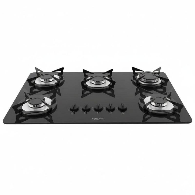 Cooktop Fogatti à Gás Fgt 5b Vidro Preto Flange Inox Preto BivoltOs cooktops da Fogatti sao perfeitos para sua cozinha. Com mesa de vidro temperado, possui dois queimadores grandes e tres medios, com acendedores inteligentes, que acendem ao girar os botoes. As trempes, grades possuem o exclusivo Sistema Anti rotacao, um sistema que impede que as grades girem ou trepidem, proporcionando muito mais seguranca e praticidade para sua familia. Alem de tudo, possui design diferenciado e e facil de limpar, com botoes removiveis para limpeza. O selo CONPET A certifica o consumo eficiente de energia e possui tambem opcoes de cores diferenciadas.Cooktop, Fogao de mesa de Embutir Caracteristicas Bivolt, serve tanto para 110V quanto para 220V 2 Queimadores Rapidos, grandes 3 Queimadores Semi rapidos, medios Mesa de Vidro temperado de 6 mm Acendedores de Seletor Automatico Inteligente, acendem ao pressionar e girar o botao Trempes, grades em Aco esmaltado, removiveis e lavaveis Sistema de combustao Italiano Exclusivo pino anti-rotacao nas trempes, grades Botoes removiveis para limpeza Flanges Inox Certificacao Conpet A Facil limpeza e design moderno Acompanha vedacao da base Especificacoes Tecnicas Tensao Bivolt Frequencia 60Hz Consumo 0,142 kWh Potencia 6,3 W para tomada em 127 V e 10,5 W para tomada em 220V 2 Queimadores rapidos, grandes 3000W cada 3 Queimadores semi rapidos, medios 1750W cada Pressao do Gas 28 a 37 mBar Tipo Gas GLP botijao, nao serve para gas natural de rua Mangueira do gas NAO acompanha o produto, deve ser adquirida a parte Dimensoes do Produto L 68,5cm x P 46cm Dimensoes do Nicho L 60,5cm x P 34cm x A 5,5cm Peso 9,30kg Garantia de Fabrica 12 meses Instalacao por conta do cliente Imagens meramente ilustrativas