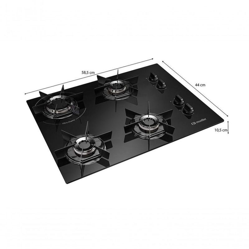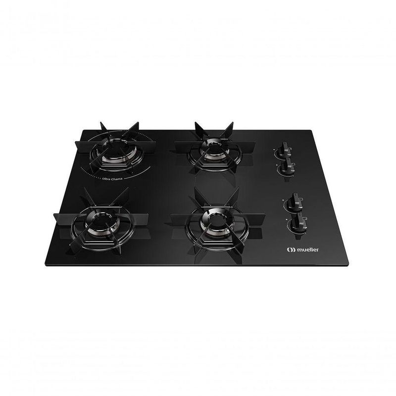 Cooktop Mueller 4 Bocas Com Queimador Ultra Chama Mcg4bb Bivolt BivoltCooktop Mueller 4 Bocas com Queimador Ultra Chama MCG4BB Bivolt Bivolt -Características Gerais do Produto:- Acendimento: Superautomático- Classificação eficiência energética: A- Dimensões da embalagem (cm): A:16,5 x L:61,5 x P:47,0- Dimensões do nicho para instalação (cm): L: 52 x P: 37,5- Dimensões do produto (cm): A: 10,5 x L: 58,5 x P: 44- Grades de mesa (quantas): 4 grades individuais em aço esmaltado com 6 pontos de apoio- Inmetro - certificações: REGISTRO INMETRO: 004553/2014- Manípulos removíveis: Sim- Material da grade: Aço esmaltado, removíveis e laváveis- Material da mesa: Vitrocerâmica 4mm- Observações: Regulador de pressão para botijão conforme certificado pelo INMETRO (NBR 8473). Recomenda-se regulador de pressão de no mínimo 1kg/h para o correto funcionamento da performance do produto.; Para Gás Liquefeito de Petróleo (GLP), use mangueira de plástico certificada pelo INMETRO (NBR 8613) ou mangueira metálica (NBR 14177) ível de 1/2 com arruela vedadora para rosca interna da mangueira. Se a instalação for com Gás Natural (GN), utilize somente mangueira metálica (NBR 13419).;- Peso: Peso líquido: 6,44 Kg / Peso bruto: 6,75 Kg- Potência dos queimadores: Queimador Semirápido: 1.700W; Queimador Ultra Chama: 2.400W- Potência sistema elétrico: 127V:1,5W | 220V:3,5W- Pressão do gás: (GLP) = 2,75 kPa (280mm.H2O); (GN) = 1,96 kPa (200mmCa)- Sistema de combustão: Italiano- Tensão: Bivolt- Tipo de controle: Botões Laterais- Tipo de gás: GLP ou GN (Sai da fábrica GLP: primeira conversão – dentro da )- Tipo de painel: Botões de Acionamento Manual- Modelo: Embutir- Modelo referência do produto: 61 0003 611 - MCG4BB- Cabo de alimentação: O plugue do Cooktop possui 3 pinos, sendo o pino central o terminal de aterramento (Não inutilize o pino de aterramento do plugue). A tomada de instalação deve ser ligada a um aterramento eficiente, atendendo às normas ABNT NBR 5410 e NBR 14136:2012.;Acompanha o produto:- Manual de Instruções- 04 tiras de espuma para vedação- Rede de postos autorizados:- 12 Meses de de Fábrica