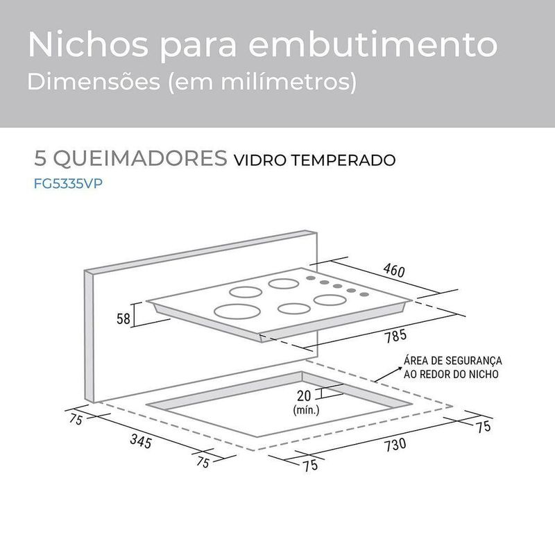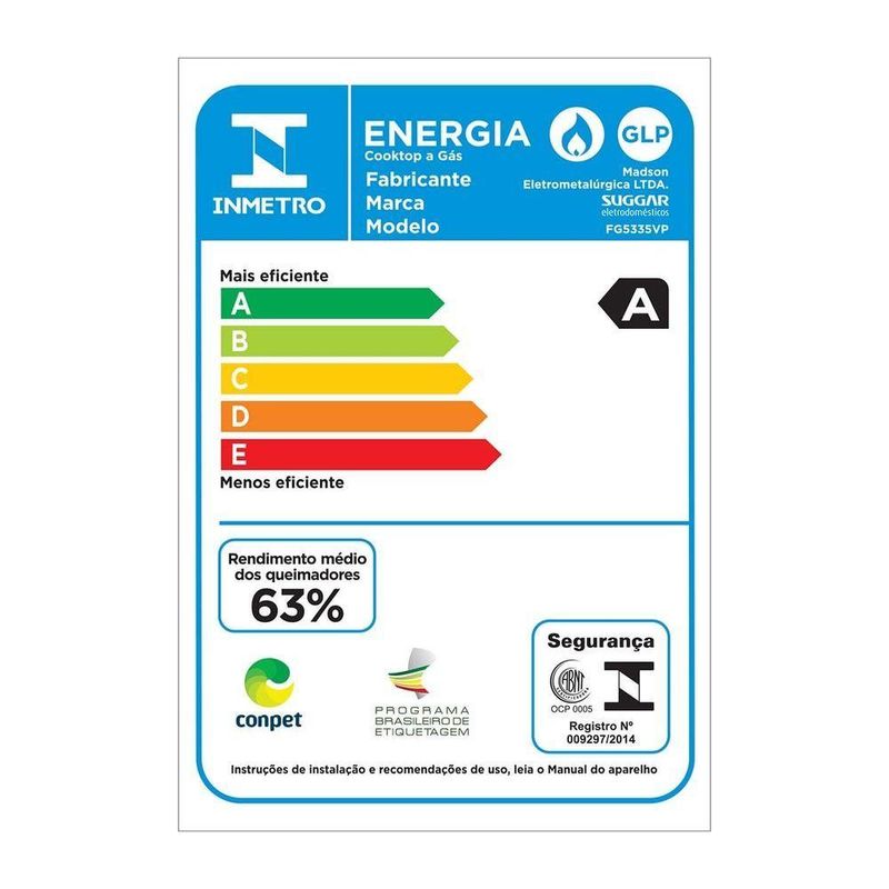 Cooktop Suggar 5 Bocas Com Tripla Chama Em Ferro Fundido FG5335VP Preto BivoltCooktop Suggar 5 Bocas com Tripla Chama em Ferro Fundido FG5335VP BivoltO Cooktop de mesa da Suggar com 5 queimadores oferece praticidade e segurança para o seu dia a dia na cozinha. Com um design elegante em vidro temperado, ele conta com acendimento superautomático e chama tripla lateral, garantindo rapidez no preparo dos alimentos sem perder o calor.Além disso, seus botões multicontrol removíveis facilitam o processo de limpeza, tornando-o mais prático e eficiente.Características:5 queimadores a gás, seladoAcendimento superautomáticoTripla chama lateralVidro temperadoTrempe de ferro fundido antideslizanteBotões multicontrol removíveisQueimadores esmaltados de diferentes tamanhosEspecificações Técnicas:Marca: SuggarModelo: FG5335VPPotência térmica: 10,35 kWQueimadores: 5 queimadores a gás, seladoAcendimento: SuperautomáticoChama: Tripla chama lateralMaterial: Vidro temperado, trempe de ferro fundido antideslizanteBotões: Multicontrol removíveisQueimadores: Esmaltados de diferentes tamanhosProduto sem Caixa (LxAxP): 78,5 x 10,4 x 46,0 cmProduto com Caixa (LxAxP): 80,5 x 18,4 x 48,0 cmPeso Produto sem Caixa: 10,5 KgPeso Produto com Caixa: 12,5 KgGarantia: 12 meses (Fornecedor)Conteúdo da Embalagem: 01 Cooktop Vidro Temperado 5 queimadores com Tripla Chama Lateral