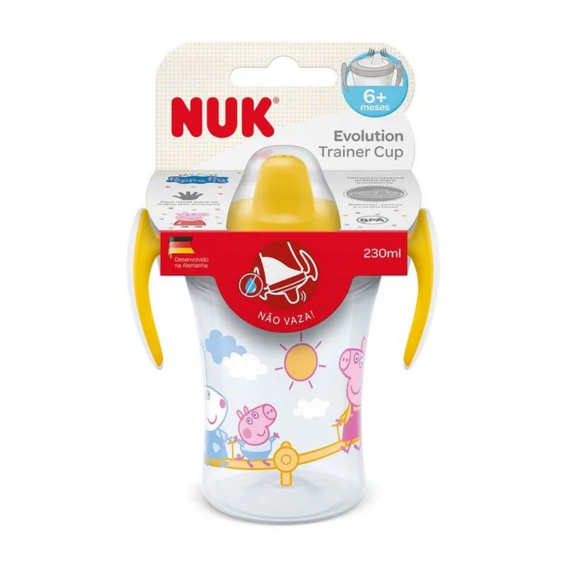 Copo de Treinamento Infantil Peppa Pig 230ml Neutro - Nuk Copo de Treinamento Infantil Evolution Peppa Pig 230ml Neutro - Nuk O Copo de Treinamento Evolution da Nuk foi desenvolvido para auxiliar na fase de transição da mamadeira para o copo, contribuindo para o desenvolvimento da independência do bebê de forma natural e divertida. Fácil de transportar e ideal para passeios, com capacidade de até 230ml. Ele possui um design moderno e alças antiderrapantes que auxiliam a pega dos pequenos. Com sistema antivazamento e bocal em silicone macio, oferece conforto para a gengiva dos bebês durante o uso diário. Produto desenvolvido com material leve e resistente, totalmente livre de Bisfenol-A. "O MINISTÉRIO DA SAÚDE ADVERTE: A CRIANÇA QUE MAMA NO PEITO NÃO NECESSITA DE MAMADEIRA, BICO OU CHUPETA. O USO DE MAMADEIRA, BICO OU CHUPETA PREJUDICA O ALEITAMENTO MATERNO." Principais Características: - Idade Recomendada: A partir de 6 meses. - Modelo: Evolution Peppa Pig - Capacidade: 230ml - Cores Atóxicas - Livre de BPA - Formato Moderno - Alças Antiderrapantes - Material Leve e Resistente - Sistema Anti Vazamento - Bocal em Silicone Macio - Toque Confortável para a Boca do Bebe Especificações Técnicas: - Conteúdo da Embalagem: 1 Copo de Treinamento Evolution - Composição/Material: Polipropileno e Silicone - Garantia: 30 Dias (Contra Defeito de Fabricação Pelo Fabricante) - Referência do Fabricante: PA7649-1N - EAN: 7896098814437 - Marca: Nuk Imagens meramente ilustrativas. As cores dos produtos podem variar de acordo com o lote do fabricante.