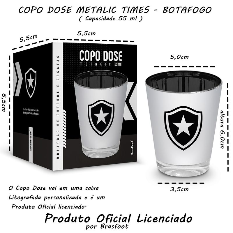 Aprecie sua bebida preferida com o divertido COPO DOSE INDIVIDUAL! Ideal para aqueles dias difíceis ? melhora o humor rapidinho! Perfeito para reunir os amigos no happy hour ou presentear alguém especial que adora compartilhar momentos irreverentes com você.Copo Dose BrasFoot Vidro Licenciado Metálic Botafogo de Futebol e Regatas 55ml PrataTodas as informações divulgadas são de responsabilidade do fabricante/fornecedor.Marca: BrasFootClassificação: Copo DoseMaterial: VidroConteúdo e Medidas: Copo Dose em Vidro Metalic - Brasão - Botafogo de Futebol e Regatas - 01 Peça.Tamanho Aproximado Produto( Boca Ø 5,0cm - Altura 6,0cm - Base 3,5cm)Capacidade: 55mlO Kit Copo Dose vai em uma caixa Litografada personalizada e é um Produto Oficial licenciado.Cuidados:Lavar com água e sabão neutroManusear com cuidadoImpactos podem danificá-loNão levar à lava- louçasProduto Original Oficial Licenciado por BrasFootColeção / Sortimento: Clubes de FutebolEstampada: Sim ( Brasão )Cor: Interno Vermelho e Externo Metalic (Prata)Fabricante: ChinaReferencia: 14397Código de Barra: 7899790285017Garantia(Fabricante): Contra Defeito de FabricaçãoImagens Meramente IlustrativasINFORMAÇÕES IMPORTANTES: Item composto apenas por 01 Copo Dose , os demais itens são meramente decorativos e NÃO fazem parte do conteúdo da embalagem.Aviso : - Todas as medidas são valores aproximados e podem sofrer alguma variação.- As cores podem sofrer uma pequena variação, dependendo do lote do produto e das configurações do seu computador.