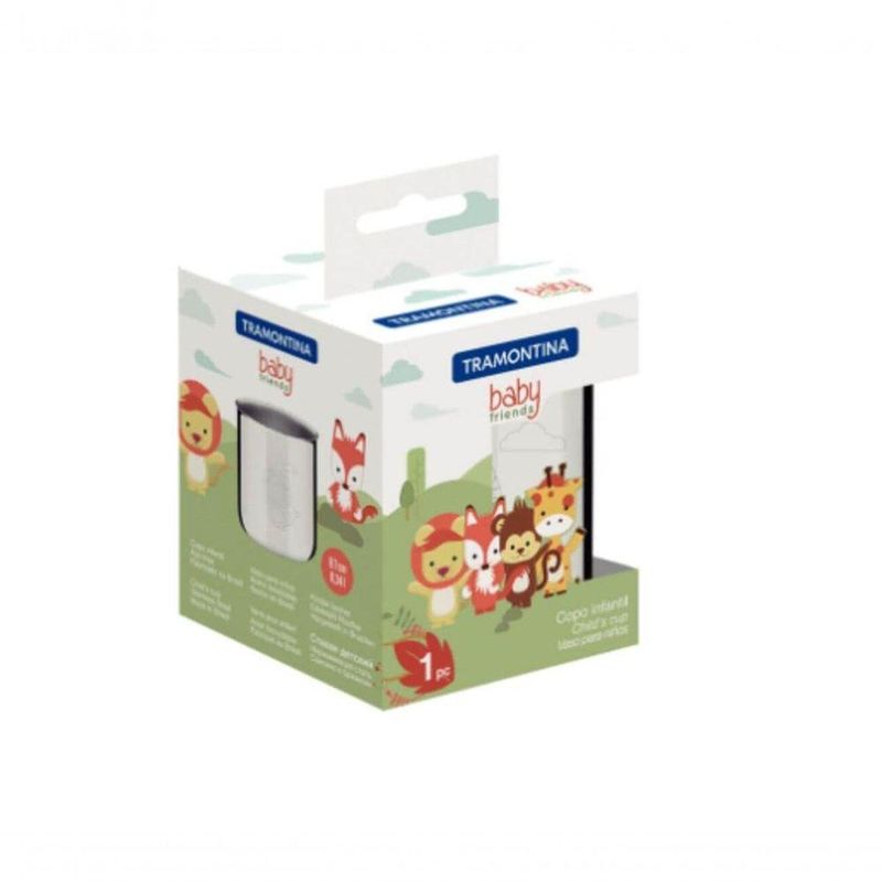 Copo Infantil Tramontina Baby Friends 340ml Em Aço Inox A linha infantil Baby Friends vai deixar as refeições de seu bebê mais divertidas e alegres. O Copo Infantil Tramontina em Aço Inox 340 ml foi criado especialmente para incentivar e auxiliar no desenvolvimento de seu filho, o utensílio é feito de aço inox e possui formato ergonômico. Com acabamento em brilho, é estampado com um desenho em baixo relevo, garantindo a felicidade do pequeno. Lave diariamente na máquina de lavar louças sem algum.Recomendações de Uso:Modo de Uos: Recomenda-se usar estes produtos para crianças com 24 meses ou mais. Use apenas sabão ou detergente e uma esponja macia. Outros tipos de produto como palha de aço, poderão riscar ou prejudicar o brilho da peça. Enxágue cada item a fim de remover totalmente os resíduos dos produtos de limpeza, que, por serem abrasivos, podem danificar o inox. Sempre que possível, use água quente, pois renova o brilho da peça. Após a lavagem, enxugue imediatamente a peça, caso contrário, as substâncias químicas da água (cloro) poderão causar manchas. Evite atrito entre as peças durante o processo de lavagem e no armazenamento, para mantê-la sem riscos. Evite o do produto com superfícies quentes, pois elas provocam a descoloração do material. Não guarde a peça em locais úmidos. A umidade também provoca manchas.Informações Adicionais:- Pode ser lavado diariamente na máquina de lavar louças;- Acabamento em brilho, com desenho estampado em baixo-relevo;- Recomenda-se usar estes produtos para crianças com 24 meses ou mais;- Copo com formato ergonômico, especialmente criado para incentivar e auxiliar no desenvolvimento das crianças.- Foto meramente ilustrativa.
