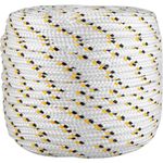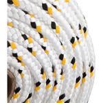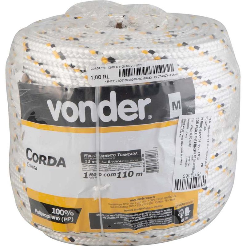 Corda Multifilamento Trançada 12,0 mm x 110 m, Branca com Detalhes em Preto e Amarelo, Vonder - Conteúdo da embalagem: 1 Rolo com 110 metros. Aplicação: Ideal para amarração de cargas, fardos, confecção de barrigueiras, redes de proteção esportivas, utilização em frigorÃficos, cortinas de aviários e na agricultura em geral. Não utilizar para elevação/transporte de pessoas, cargas ou animais. Não utilizar em cadeiras suspensas, cabos de guia de segurança e fixação de trava quedas. Variação admitida na massa e diâmetro de até 5% para mais ou para menos. Não indicada para uso externo ou locais onde possa ter incidência direta de sol, pois não possui proteção contra raios ultravioleta. Destaques: Fabricada em polipropileno - PP, possui boa resistência à abrasão e tração. Material 100% virgem. Pode conter emendas em razão do processo de fabricação. Referência: 8053121000 Garantia - E (CDC): Garantia legal: 90 dias Tipo de construção da corda: Trançada Diâmetro da corda: 12,0 mm Tipo de filamento da corda: Multifilamento Cor da corda: Branca com detalhes em amarelo e preto Material da corda: Polipropileno - PP Carga de ruptura: 926 kgf Comprimento total da corda: 110,0 m Massa aproximada (peso): 6,6 kg Destaques Comercial: Fabricada em polipropileno (PP) virgem, com boa resistência à abrasão e tração; pode conter emendas. Aplicação Comercial: Usada para amarração de cargas, fardos e redes esportivas. Não indicada para elevação, uso externo ou exposição ao sol; variação dimensional até 5%. Características Gerais do Produto: Garantia: • 3 Meses