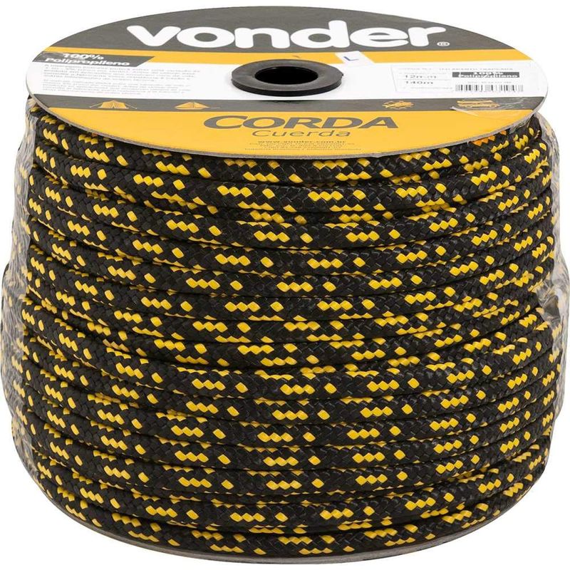 Corda Multifilamento Trançada 12,0 mm x 140 m, Cores Diversas, em Carretel, Vonder - Conteúdo da embalagem: 1 Carretel com 140 metros. Aplicação: Ideal para amarração de cargas, fardos, confecção de barrigueiras, redes de proteção esportivas, utilização em frigorÃficos, cortinas de aviários e na agricultura em geral. Não utilizar para elevação/transporte de pessoas, cargas ou animais. Não utilizar em cadeiras suspensas, cabos de guia de segurança e fixação de trava quedas. Variação admitida na massa e diâmetro de até 5% para mais ou para menos. Não indicada para uso externo ou locais onde possa ter incidência direta de sol, pois não possui proteção contra raios ultravioleta. Destaques: Fabricada em polipropileno - PP, possui boa resistência à abrasão e tração. Cores diversas, conforme disponibilidade de estoque, sem possibilidade de escolha da cor.Pode conter emendas em razão do processo de fabricação. Referência: 8053121280 Garantia - E (CDC): Garantia legal: 90 dias Tipo de construção da corda: Trançada Diâmetro da corda: 12,0 mm Tipo de filamento da corda: Multifilamento Cor da corda: Cores diversas Material da corda: Polipropileno - PP Carga de ruptura: 698 kgf Comprimento total da corda: 140,0 m Massa aproximada (peso): 7,5 kg Destaques Comercial: Fabricada em polipropileno (PP), resistente à abrasão e tração. Pode ter emendas e cores variadas. Aplicação Comercial: Usada para amarração de cargas, redes e agricultura. Não usar para elevação ou segurança. Variação de até 5%. Sem proteção UV, evitar uso externo. Características Gerais do Produto: Garantia: • 3 Meses