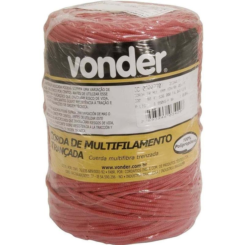 Corda Multifilamento Trançada 3,0 Mm X 277 M, Vermelha, VonderCorda Multifilamento Trançada 3,0 mm x 277 m, Vermelha, Vonder -Conteúdo da embalagem: 1 Rolo com 277 metros.Aplicação: Ideal para amarração de cargas, fardos, confecção de barrigueiras, redes de proteção esportivas, utilização em frigoríficos, cortinas de aviários e na agricultura em geral. Não utilizar para elevação/transporte de pessoas, cargas ou animais. Não utilizar em cadeiras suspensas, cabos de guia de segurança e fixação de trava quedas. Variação admitida na massa e diâmetro de até 5% para mais ou para menos. Não indicada para uso externo ou locais onde possa ter incidência direta de sol, pois não possui proteção contra raios ultravioleta.Destaques: Fabricada em polipropileno - PP, possui boa resistência à abrasão e tração. Material 100% virgem.Referência: 8041530000Garantia - E (CDC): Garantia legal: 90 diasTipo de construção da corda: TrançadaDiâmetro da corda: 3,0 mmTipo de filamento da corda: MultifilamentoCor da corda: VermelhaMaterial da corda: Polipropileno - PPCarga de ruptura: 73 kgfComprimento total da corda: 277,0 mMassa aproximada (peso): 1,0 kgDestaques Comercial: Fabricada em polipropileno (PP), com boa resistência à abrasão e tração. Material 100% virgem.Aplicação Comercial: Usada para amarração de cargas, fardos e redes. Proibido uso em elevação ou segurança. Tolerância de 5% em medidas. Não recomendada para uso externo por falta de proteção UV.Características Gerais do Produto:Garantia: - 3 Meses