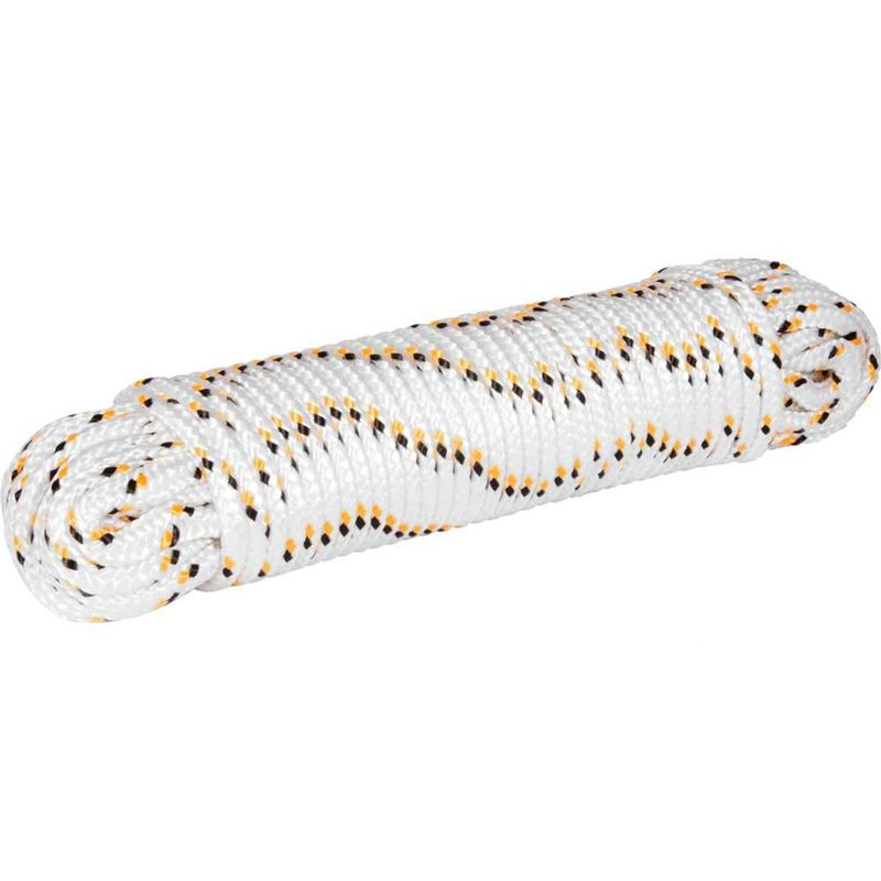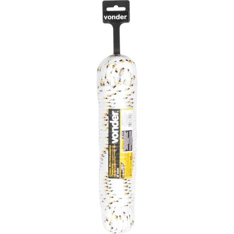 Corda Multifilamento Trançada 8,0 mm x 30 m, Branca com Detalhes em Preto e Amarelo, Cartela, Vonder - Conteúdo da embalagem: 1 Cartela com 30 metros. Aplicação: Ideal para amarração de cargas, fardos, confecção de barrigueiras, redes de proteção esportivas, utilização em frigorÃficos, cortinas de aviários e na agricultura em geral. Não utilizar para elevação/transporte de pessoas, cargas ou animais. Não utilizar em cadeiras suspensas, cabos de guia de segurança e fixação de trava quedas. Variação admitida na massa e diâmetro de até 5% para mais ou para menos. Não indicada para uso externo ou locais onde possa ter incidência direta de sol, pois não possui proteção contra raios ultravioleta. Destaques: Fabricada em polipropileno - PP, possui boa resistência à abrasão e tração. Material 100% virgem. Referência: 8046008030 Garantia - E (CDC): Garantia legal: 90 dias Material da corda: Polipropileno - PP Diâmetro da corda: 8,0 mm Comprimento total da corda: 30,0 m Tipo de construção da corda: Trançada Tipo de filamento da corda: Multifilamento Carga de ruptura: 523 kgf Cor da corda: Branca com detalhes em amarelo e preto Massa aproximada (peso): 0,65 kg Destaques Comercial: Fabricada em polipropileno (PP) 100% virgem, com boa resistência à abrasão e tração. Aplicação Comercial: Usada em amarração de cargas, fardos e redes esportivas. Inadequada para elevação, segurança ou uso externo, pois não possui proteção UV e admite variação de massa e diâmetro de até 5%. Características Gerais do Produto: Garantia: • 3 Meses
