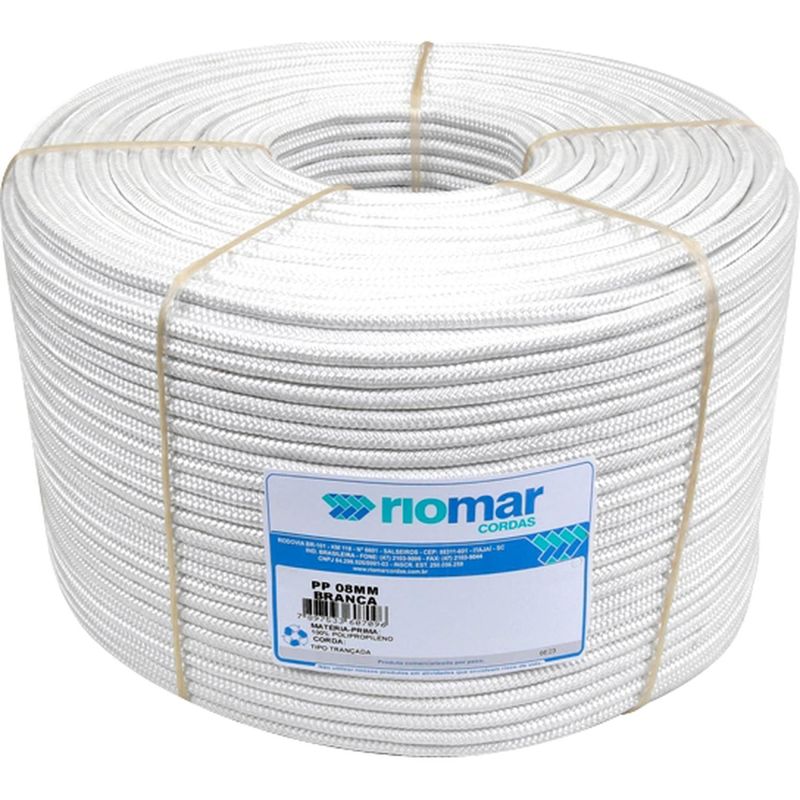 Corda Multifilamento Trançada, Branca, 8 mm x 382 m, 43208061 Riomar - Conteúdo da embalagem: 1 Rolo de corda com aproximadamente 382 metros. Aplicação: Indicada para amarração em geral, construção civil , artesanato e agropecuária. Destaques: Material mais macio e com maior brilho em cores. Não absorve água. Garantia - E (CDC): Garantia legal: 90 dias Referência: 43208061 Material da corda: Polipropileno - PP Diâmetro da corda: 8 mm Comprimento total da corda: 382 m Tipo de construção da corda: Trançada Tipo de filamento da corda: Multifilamento Cor da corda: Branca Carga de ruptura: 451 kgf Massa aproximada (peso): 15 kg Destaques Comercial: Material mais macio e com maior brilho em cores. Não absorve água. Aplicação Comercial: Indicada para amarração em geral, construção civil, artesanato e agropecuária. Características Gerais do Produto: Garantia: • 3 Meses