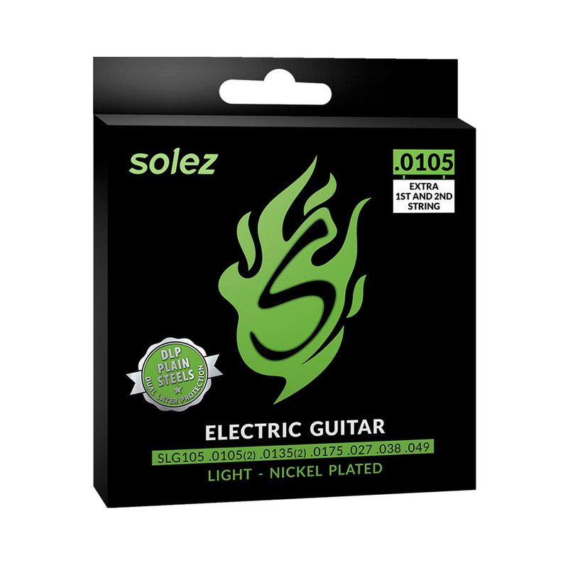 ENCORDOAMENTO SOLEZ P/ GUITARRA SLG105 - 0.0105/0.049 Corda Solez com DLP, sistema de proteção que aumenta a durabilidade das primas apresenta timbre com corpo e brilho, ótima pegada e maciez. Indicada para guitarristas que gostam de mais corpo, maior volume sonoro, mas ainda com flexibilidade e tocabilidade leve. DLP – Dual Layer Protection MEDIDAS - HÍBRIDA - SLG105 - 10.5/49 - 1.E - 0.0105 (x 2) - 2.B - 0.0135 (x 2) - 3.G - 0.0175 - 4.D - 0.027 - 5.A - 0.038 - 6.E - 0.049 FORNECEDOR - SOLEZ STRINGS