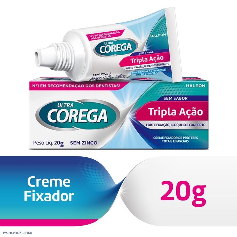 Coréga Ultra Creme sem Sabor 19gO Coréga Ultra Creme sem Sabor fixa sua prótese em até 3 direções para que você fique tranquilo o dia todo. Conta com até 12 horas de fixação, bloqueando a entrada de partículas de alimento entre a prótese e a gengiva, além de aumentar a força da mordida oferecendo segurança e conforto.