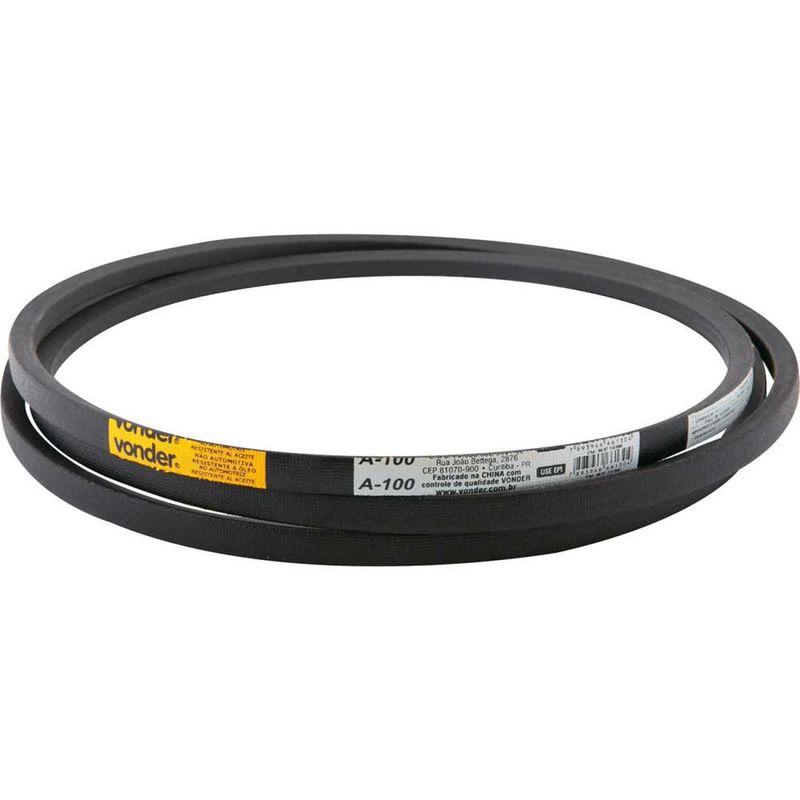 Correia Perfil V A-100 Industrial Vonder Plus OstenVonder - Conteúdo da embalagem: 1 Correia. Aplicação: Indicada para transmissão de força/velocidade do motor para o equipamento. Utilizada em máquinas industriais em geral, compressores, serras circulares de bancada, furadeiras de bancada e de coluna, betoneiras, entre outros. Não automotiva. Destaques: Composto à base de borracha natural que mantém os cordonéis na posição correta e protege a correia contra danos causados pela compressão. Possui tecido de algodão impregnado com borracha natural que protege os componentes internos da abrasão e do óleo. Conta ainda com fios de fibra sintética que têm como função a transmissão de força. Referência: 6697110000 Garantia - E (CDC): Garantia legal: 90 dias Perfil da correia: A Largura: 13 mm Espessura aproximada: 8 mm Referência da correia: A-100 Comprimento interno da correia: 2.540 mm Modelo: V Numero de seção: 1 Massa aproximada (peso): 0.284 kg Destaques Comercial: Composto de borracha natural com tecido de algodão e fibras sintéticas que protegem e transmitem força. Aplicação Comercial: Usada na transmissão de força do motor em máquinas industriais como compressores, serras e betoneiras. Características Gerais do Produto: Garantia: • 3 Meses