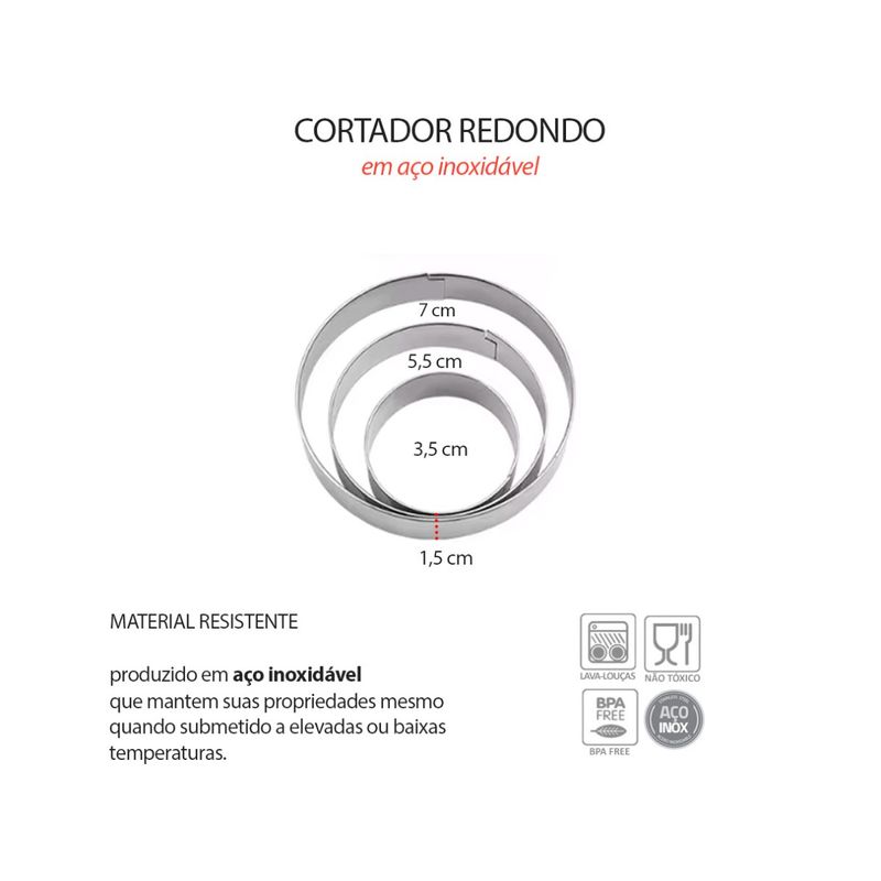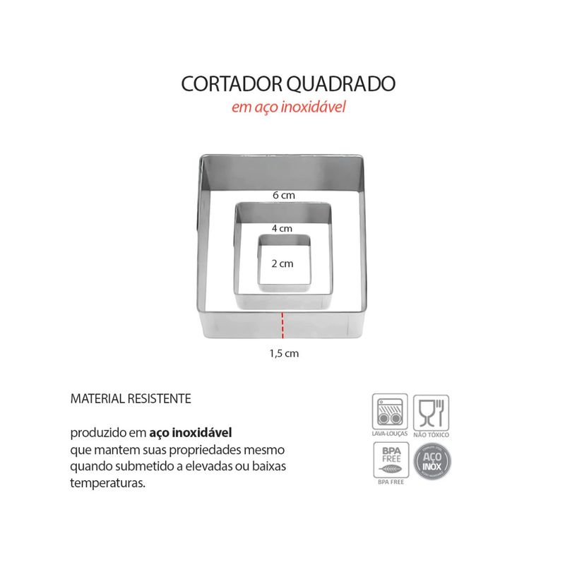 Cortadores de bolo, cupcake, massas, pao, tortas e outros. O jogo de cortadores de bolo foi produzido em aço inox e sao essenciais para confeiteiros e amantes da confeitaria. Os cortadores sao praticos, funcionais e precisos na forma. Contem: 3 Cortadores Quadrados Medidas: 6 x 1,5 cm Medidas: 4 x 1,5 cm Medidas: 2 x 1,5 cm 3 Cortadores Redondos Medidas: 7 x 1,5 cm Medidas: 5,5 x 1,5 cm Medidas: 3,5 x 1,5 cm Material: Aço Inoxidavel