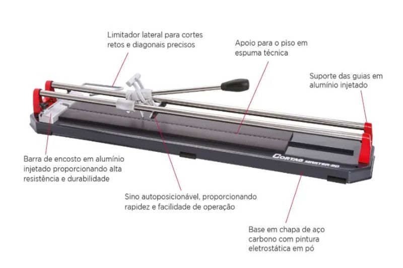 Comprimento de corte: 1,15 metros O cortador profissional MASTER 115 é indicado para cortar pisos cerâmicos e porcelanatos com até 12 mm de espessura. ¿ Possuem corte e separação na própria base, sem a necessidade de retirar a peça para fazer a separação; ¿ Guias em aço cromado; ¿ Carro-guia e barra de encosto em alumínio injetado; ¿ Rodel cortante com haste em aço carbono zincado e disco de carboneto de tungstênio (wídia). Caracteristicas: Apoio para o piso em espuma técnica; Barra de encosto em alumínio injetado proporcionando alte resistência e durabilidade; Sistema para separação de pisos na base do cortador proporcionando rapidez e facilidade de operação; Limitador lateral para cortes retos e diagonais precisos; Base e suporte das guias em chapa de aço carbono com pintura eletrostática a pó. Sino auto posicionável, proporcionando rapidez e facilidade de operaçãoSKU: 10200142