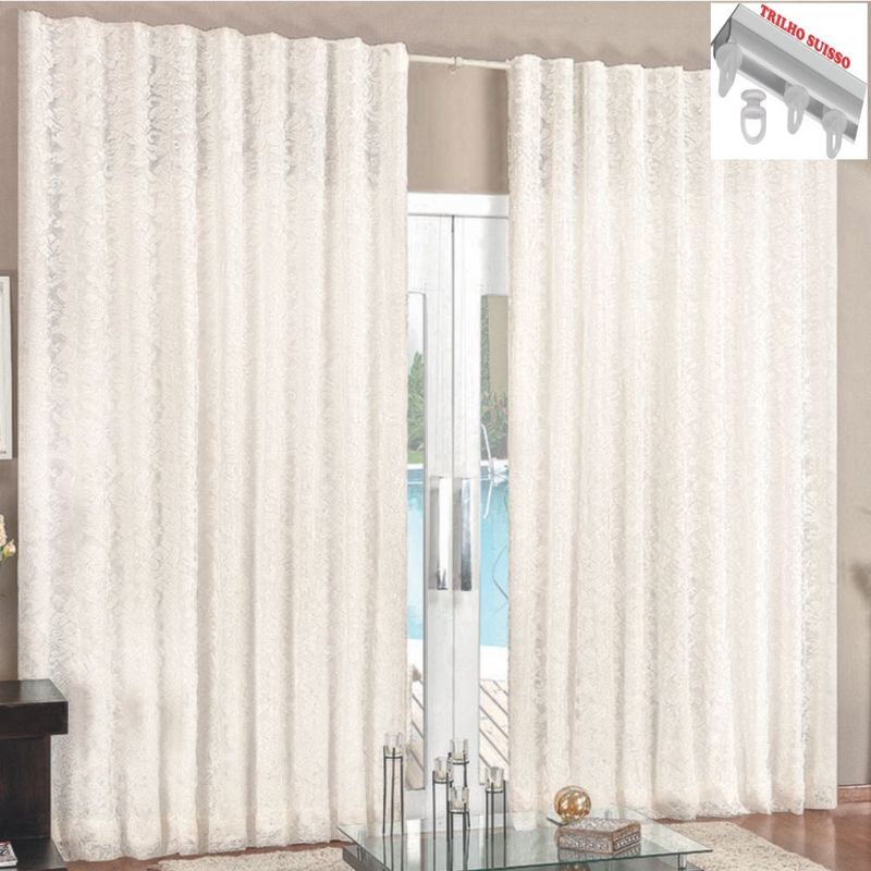 Cortina 4 Mts Sala Quarto Renda com Voal para Trilho Suisso UTILIZAMOS MATÉRIAS-PRIMA DE EXCELENTE QUALIDADE QUE RESISTEM À PROCESSO DE LAVAGEM, MANTENDO A BELEZA E DURABILIDADE DO PRODUTO. Contém na embalagem: 01 Cortina 4,00m (Largura) x 2,80m (Altura) (Dividida em duas partes) Composição: Tecido Renda e Voal: 100% Poliester * Não inclui o Trilho Atenção: A foto apresentada no Anuncio pertence ao nosso Atelier, é a foto original do produto(Cuidado com as Falsificações) As Cores podem mudar de acordo com o Monitor. Fique atento à descrição do produto.