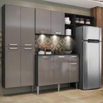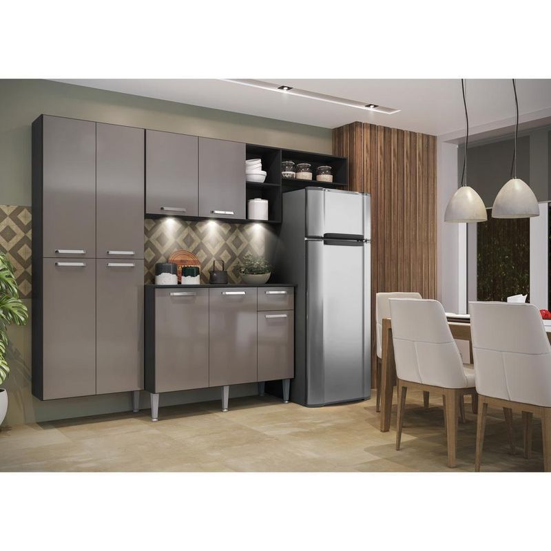 A Cozinha Completa Compacta com 3 Leds, Armário e Balcão com Tampo 3 peças Pequim Sun Multimóveis tem um excelente custo benefício e um amplo espaço interno. Os módulos são individuais e você pode montar da maneira que se adaptar melhor ao seu ambiente (exceto o nicho para fogão/geladeira que é anexo ao armário aéreo). O paneleiro pode ser montado de forma suspensa, o que permite você ajustar a altura para encaixar a geladeira. Produzida em MDP, que garante maior durabilidade e resistência, possui corrediças metálicas (mais leveza no manuseio), pés com regulagem de altura (permitem um perfeito nivelamento dos módulos), puxadores em ABS com acabamento cromado e tampos em MDP 15mm com pintura de alta resistência. Para deixar sua cozinha mais bonita e organizada, possui compartimento especial para utensílios mais altos e módulo aéreo com nichos. As luminárias em LED, que acompanham a cozinha, proporcionam um visual mais bonito e moderno, deixando o ambiente aconchegante e confortável. Com design minimalista e de fácil instalação, você pode escolher em qual lugar do móvel deseja fixar. Com luz brilhante, a luminária funciona com 3 pilhas AAA.Conteúdo da Embalagem:1 (um) armário aéreo com nicho lateral e horizontal de 166 cm1 (um) paneleiro duplo de 62 cm1 (um) balcão com tampo de 105 cm1 (um) kit com 3 Luminárias LEDDimensões do produto montado:Cozinha: Altura: 184 cm | Largura: 228 cm | Profundidade: 27 cm (aéreos e paneleiro) - 44,5 cm (balcão com tampo)Espaço do nicho para fogão/geladeira: Altura: 162 cm | Largura: 61 cm*Você pode consultar as medidas internas na imagem técnica do produto.Disponível na cor:Preto Texturizado/Lacca Fumê Brilho*As cores do produto podem sofrer variações de tonalidade de acordo com as configurações do seu dispositivo.Imagem meramente ilustrativa. Decoração e eletros não acompanham o produto.O produto será entregue desmontado e não disponibilizamos o serviço de montagem..