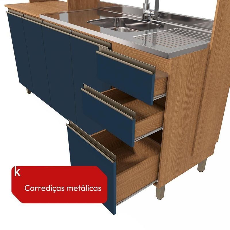 Cozinha Compacta Luna Com Cuba De Pia Kappesberg 3 Peças Canela/azul ProfundoPara quem gosta de beleza sem abrir mão de praticidade, a Cozinha Compacta c/ cuba de pia CB1344 da Kappesberg é a escolha certa. Compacto e muito funcional, o kit reúne tudo que você precisa, trazendo facilidade e organização ao seu dia.Produzido em chapas MDP de 12 e 15mm, o que garante robustez, firmeza e qualidade, ela conta com até sete camadas de pintura na cor canela, em pintura touch, com a textura dos veios da madeira, remetendo aos tons da natureza e trazendo qualidade à sua cozinha, combinando com todos os espaços.Com pés em polipropileno e puxadores em alumínio na cor bronze, que garantem um acabamento lindo, o kit é conjugado, contando com amplo espaço interno, entre prateleiras e gavetas, ideais para organizar louças e mantimentos, deixando suas tarefas mais práticas e sua cozinha sempre em ordem.E com módulo para forno e microondas, você terá o espaço perfeito para seus eletrodomésticos, assim como o nicho superior, que facilita o acesso a itens usados diariamente. Já a cuba de pia, de 120cm, além de facilitar as tarefas do dia, ainda deixa o kit mais completo e funcional, completando o design do produto.Medidas:- 212 cm de altura- 192,5 cm de largura- 52 cm de profundidadeItens inclusos:- Sete (7) portas tradicionais (portas de bater)- Três (3) gavetas internas (corrediças metálicas)- Cinco (5) prateleiras- Pés em polipropilenoCódigo do produto: CB1344-CNAZPInformações importantes:- As imagens são ilustrativas.- A Kappesberg não disponibiliza serviço de montagem (recomendamos a contratação de um profissional qualificado).- O manual de montagem acompanha o produto.- Obs: Acompanha cuba de pia.- 3 meses de garantia para defeitos de fabricação. Acabamento: Pintura Touch | Cor: Canela / Azul Profundo | Corrediças: Metálicas | Dobradiça: Sem Amortecimento | Garantia: 3 meses para defeito de fabricação | Matéria-prima: MDP | Peso suportado por cada gaveta: 6 Kg | Peso suportado por cada prateleira: 7 kg | Quantidade de gavetas: 3 | Quantidade de prateleiras: 6 | Sistema de montagem: Parafuso Philips | Requer montagem: Sim | Tipo de cozinha: Cozinha compacta | Duração da Garantia: 3 meses | Montagem: Necessita montagem | Tipo de Garantia: Garantia do fabricante