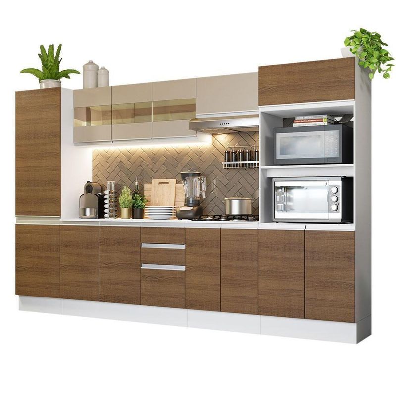 Cozinha Completa 100% MDF Madesa Smart 300 Cm Modulada Com Armário E Balcão Branco/Rustic/CremaA Cozinha Completa Smart é moderna, bonita e desenvolvida com materiais de altíssima qualidade. Seu maior destaque é ser em 100% MDF, material ecologicamente correto que confere a boa resistência e durabilidade à peça.É uma cozinha planejada, pois seus módulos são separados, podendo ser montados conforme a disposição desejada. Internamente é uma cozinha bem dividida e muito espaçosa. Oferece excelente distribuição interna do espaço para que você organize toda a sua louça e armazene alimentos.Possui puxadores em alumínio, corrediças e dobradiças metálicas e rodapés encaixados com pés em PVC com regulagem de altura. Seu aéreo em vidro agrega beleza e sofisticação. Um grande diferencial é que contempla o tampo do balcão de pia que pode ser removido para a colocação de uma pia. Já o balcão de 60 cm segue com tampo que pode ser recortado para a colocação do cooktop.Para completar, o acabamento é em pintura poliéster de alta resistência e fácil limpeza que confere beleza e praticidade. Disponível nas opções totalmente branca ou internamente branca e com as portas em crema e amadeirado Rustic com toque de madeira natural. As medidas totais são: 300 cm de largura e 195 cm de altura; profundidade de 47 cm nos balcões e paneleiro e de 27 cm nos aéreos.Itens inclusos:- Uma (1) torre com nichos para forno e micro-ondas com três (3) portas, sendo uma (1) basculante- Um (1) balcão de 120 cm com três (3) portas e duas (2) gavetas- Um (1) tampo de madeira branco para balcão de pia de 120 cm x 47 cm- Um (1) aéreo de 120 cm com portas com detalhe em vidro- Um (1) balcão para cooktop de 60 cm com duas (2) portas- Um (1) tampo de madeira branco para balcão de 60 cm x 47 cm- Um (1) aéreo de 60 cm com porta basculante- Um (1) paneleiro de 50 cm com duas (2) portas(Imagem ilustrativa: os eletros e as decorações não acompanham o produto.)Código do produto: GRSM300001A9Obs.: A Madesa não disponibiliza serviço de montagem.1-O produto é novo ou usado?R.: Todos os produtos da Madesa são novos, enviados da nossa fábrica diretamente para as casas de nossos clientes.2-O produto vem montado? Se não, vocês realizam a montagem?R.: A Madesa não disponibiliza serviço de montagem. Todos os produtos seguem com manual de instalação e as ferragens necessárias. Alguns produtos possuem vídeo explicando o passo a passo da montagem.3-Vocês possuem loja física? Posso retirar meu produto em mãos?R.: Não possuímos loja física, apenas loja virtual. Confira as opções de envio ao colocar o seu CEP.4-Qual é o valor do envio? Posso pagar separadamente?R.: O valor do envio é calculado com base no peso e volume do produto, e no CEP de destino. Você pode calcular o valor e prazo de entrega no simulador.5-A Madesa entrega em todo Brasil? Como é feita a entrega?R.: Sim, entregamos no Brasil inteiro através de transportadoras parceiras.6-O produto acompanha Nota Fiscal?R.: Sim, todos os produtos são entregues com suas respectivas notas fiscais.7-Os produtos possuem garantia?R.: Sim. A Madesa oferece 3 meses de garantia para defeitos de fabricação.Cor: Marrom | Garantia: 3 meses contra defeitos de fabricação | Dimensões - Altura: 195 cm | Dimensões - Largura: 300 cm | Dimensões - Profundidade: 47 cm | Produto: Cozinha | Marca: Madesa | Peso aproximado: 163 KG | Material: MDF | RBN: Cozinha | Comprimento Produto Com Embalagem (cm): 206.2 | Largura Produto Com Embalagem (cm): 59.2 | Altura do Produto com Embalagem (cm): 60.9 | Peso Produto Com Embalagem (Kg): 165.6 | Nome do Simples no Fornecedor: Cozinha Completa 100% MDF Madesa Smart 300 cm Modulada Com Armário e Balcão - Branco/Rustic/Crema | Produto precisa de Montagem?: Sim, sugerimos a contratação do nosso serviço de montagem (para os CEPs em que o serviço está disponível) ou de algum profissional experiente de sua preferência | Conteúdo da embalagem: 1 Cozinha Completa | Descrição do Tamanho: 195 cm x 300 cm x 47 cm | Tempo de entrega do Fornecedor (dias): 1 | Estado de Origem: RS | Material para Filtro: MDF | Fabricante: Madesa | Cor: Branco/Rustic/Crema