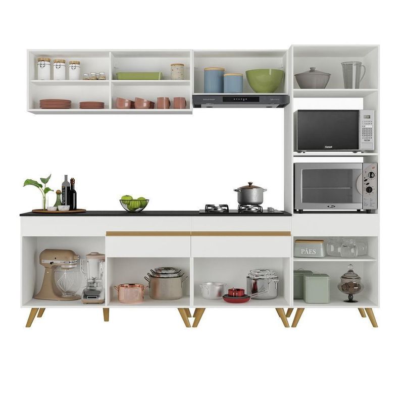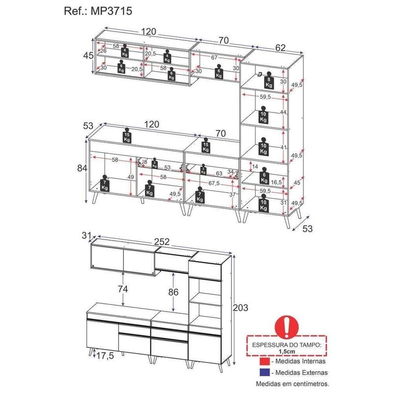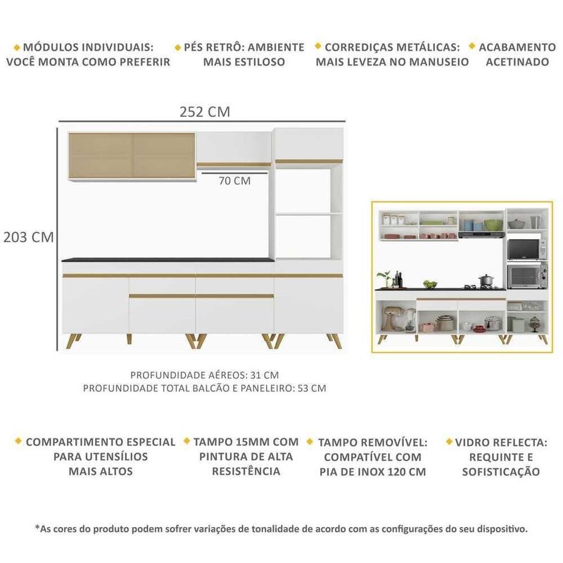 A Cozinha Completa 5 peças com Armário e Balcão MP3715 Veneza Multimóveis tem um excelente custo benefício e um amplo espaço interno. Produzida em MDP com acabamento acetinado (cerca de 20% de brilho), que garante maior durabilidade e resistência, possui corrediças metálicas (mais leveza no manuseio), pés retrô em polipropileno, que deixam o ambiente mais estiloso, puxadores em ABS e tampo em MDP 15mm com pintura de alta resistência. Os módulos são individuais e você pode montar da maneira que se adaptar melhor ao seu ambiente. O balcão possui tampo removível ( com pia de 120 cm). Para deixar sua cozinha mais bonita e completa possui vidro reflecta, compartimento especial para utensílios mais altos, balcão para cooktop, além de espaço para forno e microondas.Conteúdo da Embalagem:1 (um) Armário aéreo 120cm1 (um) Balcão com tampo 120cm1 (um) Armário aéreo 70cm1 (um) Balcão com tampo 70cmcm1 (um) Paneleiro 62cmDimensões do produto montado:Altura: 203cm | Largura: 252cm | Profundidade: 31cm (aéreos) - 53cm (paneleiro e balcão com tampo)*Você pode consultar as medidas detalhadas na imagem técnica do produto.*As cores do produto podem sofrer variações de tonalidade de acordo com as configurações do seu dispositivo.Imagem meramente ilustrativa. Decoração e eletros não acompanham o produto.O produto será entregue desmontado e não disponibilizamos o serviço de montagem..