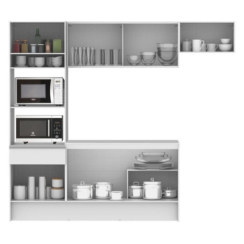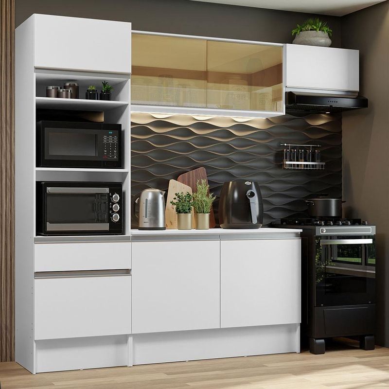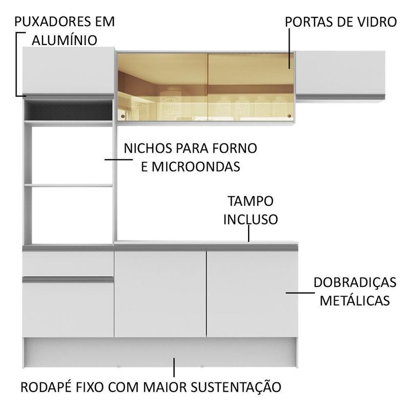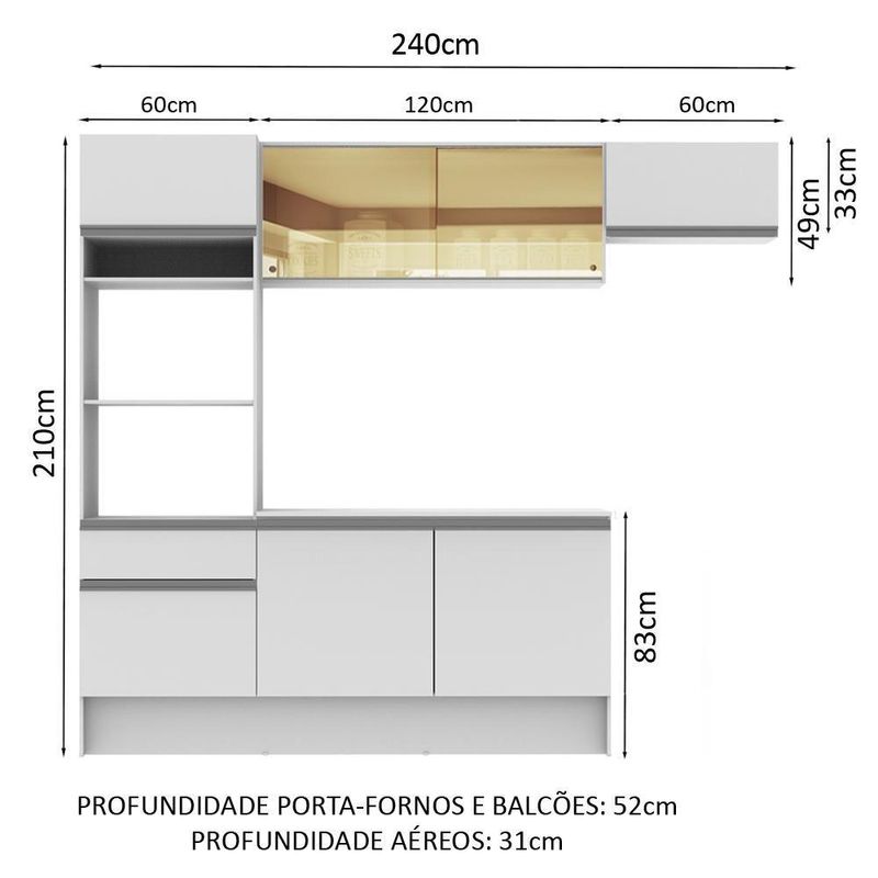 Cozinha Completa Diamante com Armário Balcão e Tampo MadesaCaracterísticas:- Totalmente versátil e combina com ambientes modernos, retrô ou coloridos- Puxadores em perfil total de alumínio, dobradiças e corrediças metálicas- Aéreo em vidro reflex- Tampo do balcão de pia que pode ser removido para a colocação de uma pia com as medidas de até 120 cm x 52 cm- Balcão para cooktop tem 60 cm x 52 cm e segue com tampo que pode ser recortado para a colocação do cooktop- O paneleiro e o balcão de pia são montados juntos conferindo maior estabilidade- O acabamento da cozinha é branco- Processo feito em Poliéster Protetor ecológico- As imagens são meramente ilustrativas- Os eletros e as decorações não acompanham o produtoEspecificações Técnicas:- Marca: Madesa- Código do produto: GRGL30000109SR- Cor: Branco/Rustic- Produto: Cozinha- Material: MDP- RBN: Cozinha Completa- Itens inclusos: Uma (1) torre com nichos para forno e micro-ondas, com uma (1) gaveta e duas (2) portas, sendo uma basculante com um (1) balcão agregado de 120 cm com duas (2) portas | Um (1) aéreo de 120 cm com portas deslizantes em vidro reflex | Um (1) tampo de MDP branco para balcão de pia de 120 cm x 52 cm | Um (1) aéreo de 60 cm com porta basculante- Medidas totais: 240 cm de largura e 210 cm de altura; profundidades de 31 cm nos aéreos e 52 cm nos balcões e na torre- Dimensões da Embalagem (AxLxP): 34,1cm x 61,8cm x 217,9cm- Peso (Kg): 93- Garantia: 3 meses