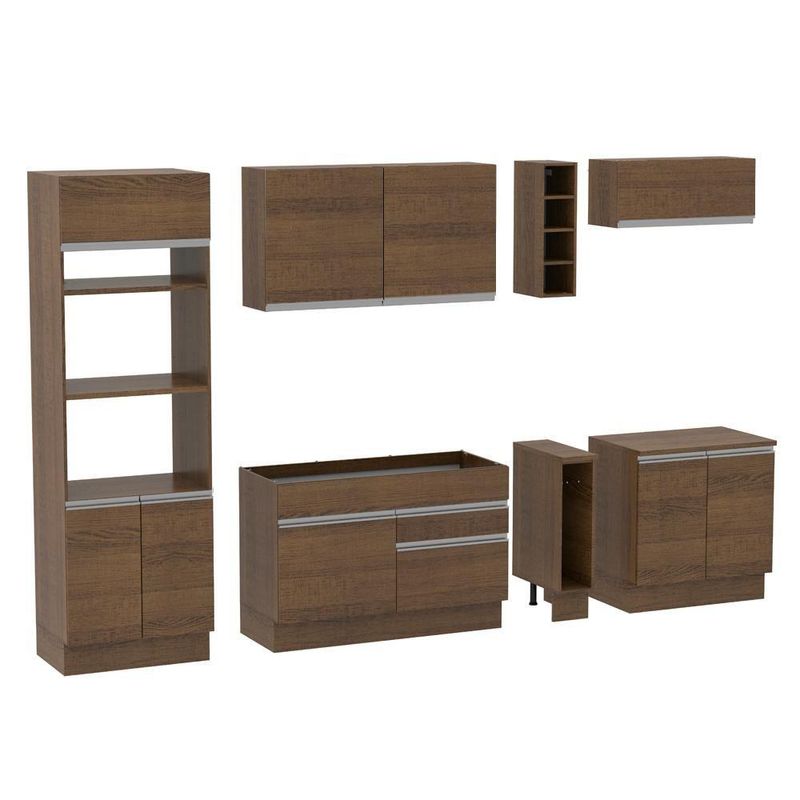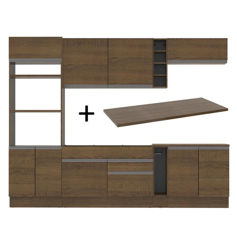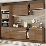 Cozinha Completa Vicenza com Armário e Balcão + Tampo MadesaCaracterística:- Uma cozinha completa com design moderno e um ótimo acabamento- Se destaca por parecer uma cozinha planejada com ótimo aproveitamento dos espaços internos- As gavetas possuem corrediça telescópica e todas as portas possuem amortecedor para o fechamento suave- Esses itens de qualidade superior conferem durabilidade e maior vida útil do móvel- Outro grande diferencial desta cozinha é a profundidade maior, como uma cozinha planejada 52cm no balcão inferior e 31cm nos aéreos- O balcão de pia comporta pias de 120cm x 52cm e acompanha tampo em pintura amadeirado Rustic- Já o balcão menor segue com tampo de 80 x 52cm que pode ser recortado para a colocação do cooktop- Possui também pés reguláveis e rodapé removível- Acabamentos em pintura poliéster ecológica de alta resistência, que aumenta a qualidade e durabilidade do produtoEspecificações Técnicas:- Marca: Madesa- Ref.: GRGL2900125Z- Cor: Rustic- Material: MDP- Itens inclusos: Um (1) porta fornos com dois (2) nichos para forno e micro-ondas e três (3) portas sendo uma (1) basculante | Um (1) balcão de pia com duas (2) gavetas e uma (1) porta e tampo em MDP | Um (1) porta panos | Um (1) balcão com duas (2) portas e tampo em MDP | Um (1) aéreo com duas (2) portas com detalhe em vidro reflex | Um (1) aéreo com uma (1) porta basculante | Uma (1) mini adega- Peso líquido (Kg): 192- Peso bruto (Kg): 194,6- Dimensão total do produto (AxL): 225 x 290cm | Profundidade balcões e paneleiro 52cm e aéreos 31cm- Dimensão da embalagem (AxLxP): 102,9 x 230 x 62cm- Garantia: 3 meses
