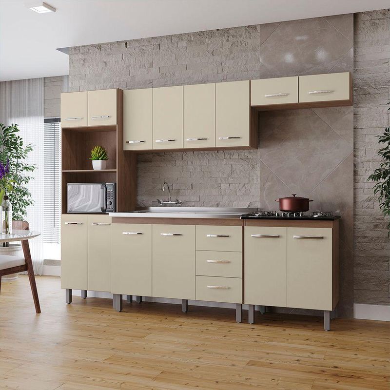 Cozinha íris Completa Com Balcão Rosa E Cooktop 5 Bocas Mb1 300cm Cor Savana Off WhiteNÃO ACOMPANHA PIA E COOKTOP!Balcão para pia de 120cm.Abertura do Tampo para Cooktop 5 bocas.Este móvel de cozinha completa apresenta um design moderno e funcional, com armários superiores e inferiores, gavetas, nichos abertos e espaços dedicados para eletrodomésticos. Conta com puxadores horizontais e pés elevados que facilitam a limpeza e garantem praticidade no dia a dia. É ideal para organizar o ambiente com estilo e eficiência, aproveitando bem o espaço disponível.Dimensões do Balcão:Altura: 82,70 cmLargura: 118 cmProfundidade: 50 cmDimensões do Paneleiro:Altura: 197 cmLargura: 60 cmProfundidade: 37,8 cmDimensões do Áerio:Altura: 52 cmLargura: 118 cmProfundidade: 27 cmDimensões do Áerio Geladeira:Altura: 22 cmLargura: 79 cmProfundidade: 27 cmDimensões do Móvel para Cooktop:Altura: 83 cmLargura: 75 cmProfundidade: 50 cmRecomendações de limpeza:-Limpar com flanela limpa e seca. Não molhar o móvel e não expor em lugar úmido ou próximo de fontes de calor. Não usar produtos abrasivos.Diferenciais da Cozinha Íris;- Material da Estrutura: fabricado com MDP12/15mm- Detalhes do Balcão: Dobradiças Reforçadas; Corrediças Telescópias; Puxadores Horizontais, finalizados com um excelente acabamento;