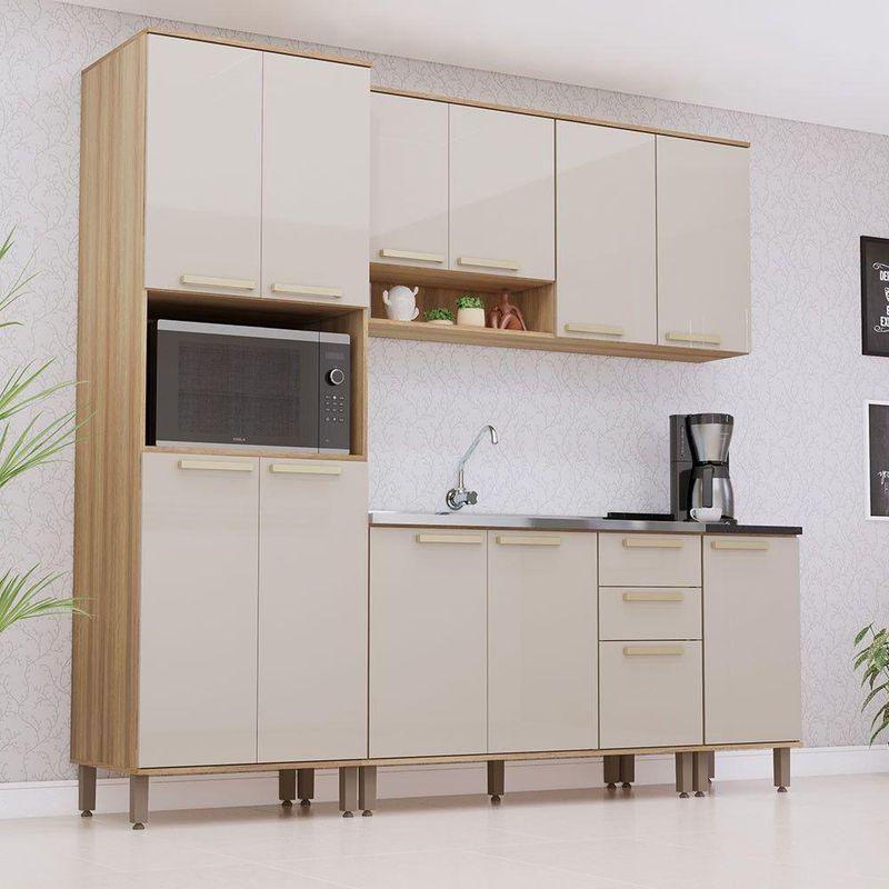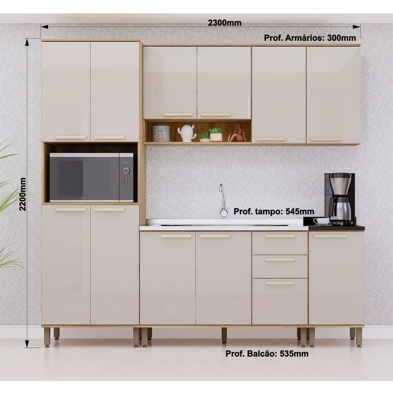 Cozinha Modulada Compacta 5 Peças Sem Tampos E Sem Pia Isis Avelã/mocca LacaCozinha Modulada Compacta 5 Pecas sem Tampos e sem Pia Isis Luciane MoveisDesenvolvida com materiais de excelencia, a Cozinha Isis oferece excelente distribuicao de espaco interno. E estruturada em 100 MDP e possui dobradicas slow motion com amortecedor incorporado para fechamento suave das portas. Conta com puxadores tipo aste em plastico Gold dando um toque especial de classe e elegancia. Caracteristicas Estrutura: 100 MDP Acabamento da Caixaria/Corpo: PF Acabamento das Portas/Frontal: Laca Quantidade de Portas: 12 Tipo de Abertura das Portas: de Bater/Abrir Tipo de Dobradicas: Metalicas 35mm Slow Motion Quantidade de Gavetas: 2 Tipo de Corredicas: Metalicas Telescopicas Tipo de Puxadores: Aste em Plastico Gold Quantidade de Prateleiras: 8 Tampo e Rodatampo: Tampos em MDP 25mm e rodatampo de 6cm de altura Sistema de Montagem: Cavilhas e Parafusos Garantia do Fabricante: 3 meses Medidas Gerais do Ambiente 220 x 230 x 54,5 (Alt x Larg x Prof - cm) Volumes: 12 unidades Ambiente Composto por - 1 Paneleiro 70cm 4 Portas com 1 Nicho Microondas Isis Luciane Moveis 220 x 70 x 53,5 (A x L x P - cm) - 1 Armario Aereo 120cm 3 Portas e Nicho Isis Luciane Moveis 73,3 x 120 x 30 (A x L x P - cm) - 1 Armario Aereo 40cm 1 Porta Isis Luciane Moveis 73,3 x 40 x 30 (A x L x P - cm) - 1 Balcao de Pia 120cm 03 Portas e 2 Gavetas sem Tampo Isis Luciane Moveis 84,1 x 120 x 53,5 (A x L x P - cm) - 1 Balcao de Cozinha com Tampo 40cm 1 Porta Isis Luciane Moveis 86,6 x 40 x 54,5 (A x L x P - cm) Fique de olho - Siga sempre as orientacoes do fabricante e utilize seu produto de acordo com o manual. - A empresa nao se responsabiliza pelo mau uso do produto, o que pode causar perda da garantia.#8239; - Certifique se que seus dados estejam atualizados, como endereco e um telefone valido. - A entrega sera realizada no terreo, sendo assim, em predios o deslocamento da mercadoria, subir escadas, elevadores ou transporte por guincho para apartamentos fica sob responsabilidade do comprador. - Todas as nossas entregas sao realizadas em horario comercial, nao sendo possivel fazer agendamento, sugerimos acompanhar o rastreio do pedido e ter alguem para receber no endereco indicado. - Nao nos encarregamos por montagens, desmontagens e outras instalacoes. Essas demandas serao de responsabilidade do comprador. - A tonalidade da cor pode variar de acordo com a iluminacao e/ou as configuracoes do seu monitor. - Objetos e decoracoes nao acompanham os produtos, imagens sao meramente ilustrativas.