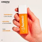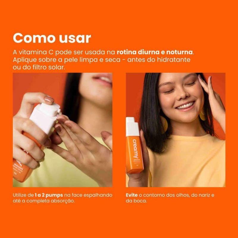 Creamy Vitamina C - Sérum Facial 30gCreamy Vitamina C - Sérum Facial 30gO que é?O sérum antioxidante da Creamy tem 10% de vitamina C. A Ethyl-Vitamina-C e a Vitamina C Glicosilada foram combinadas para entregar alto poder antioxidante, clareador e anti-aging, prevenindo e melhorando sinais da idade como rugas finas e diferenças de pigmentação.Os antioxidantes são poderosos ativos que neutralizam a ação dos radicais livres, causadores de manchas na pele, rugas e flacidez. O uso prolongado da Vitamina C melhora a qualidade da pele, uniformizando o tom, prevenindo e atenuando rugas.O ativo principal foi associado a outros antioxidantes consagrados como a Vitamina E e o ácido ferúlico, complementando o potencial antioxidante e estabilizando a fórmula. Possui textura leve, de rápida absorção, ideal para todos os tipos de pele, inclusive as mais oleosas.O que você pode esperar desse produto:textura em sérum de rápida absorção;complexo concentrado de antioxidantes;efeito clareador de manchas;ação anti-aging;melhora e previne rugas finas;hidratação, brilho e firmeza à pele.CIÊNCIA POR TRÁSA Creamy traz a combinação perfeita dos derivados mais estáveis da Vitamina C para que o efeito antioxidante seja mantido por mais tempo.O Ethyl-Ascorbic Acid e o Ascorbilglucoside são moléculas de vitamina C modificadas para aumentarem sua estabilidade, evitando a oxidação antes de chegarem na pele. Sua ação antioxidante só se inicia quando o produto é aplicado sobre a pele, o que confere maior durabilidade para a fórmula e proteção prolongada.A combinação da Vitamina E e Ácido ferúlico oferecem uma proteção extra contra os radicais livres, sendo importantes para a saúde da pele. A fórmula tem pH otimizado para entregar o máximo de efeito com o menor risco de irritação.