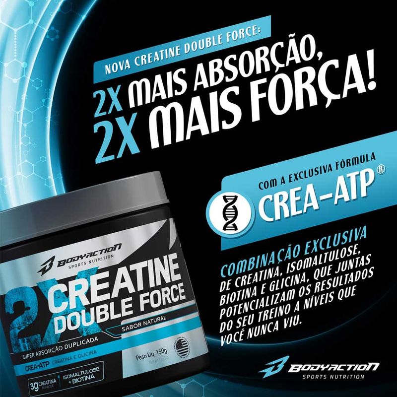 Creatina double force super absorção 150G - body action creatina double force é um suplemento a base de Creatina Monohidratada, Isomaltulose (Palatinose), Glicina e Biotina: uma potente e exclusiva combinação que promove maior eficácia e absorção da creatina, além de agir no aumento da força, visando apoiar seus resultados nas atividades físicas. crea-atp A Creatina auxilia no aumento do desempenho físico durante exercícios repetidos de curta duração e alta intensidade. A fórmula com Glicina potencializa a ação da creatina. Isomaltulose (Palatinose) + Biotina Auxilia na recuperação da função muscular normal após exercícios extenuantes, além de ajudar na absorção da creatina.