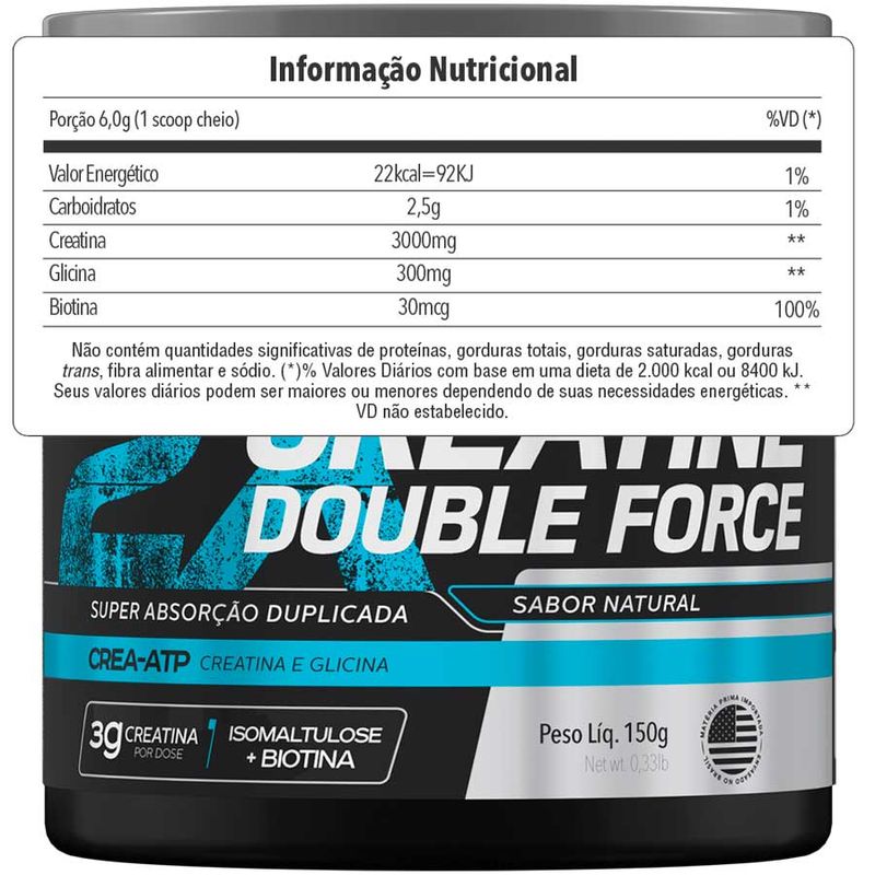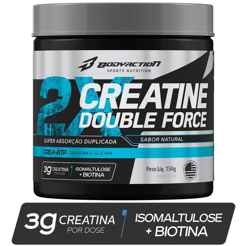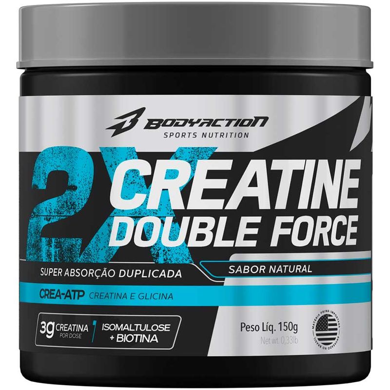 Creatina Double Force 150g Bodyaction creatina double force é um suplemento a base de Creatina Monohidratada, Isomaltulose, Glicina e Biotina: uma potente e exclusiva combinação que promove maior eficácia e absorção da creatina, além de agir no aumento da força, visando apoiar seus resultados nas atividades físicas. CREA-ATP A Creatina auxilia no aumento do desempenho físico durante exercÍcios repetidos de curta duração e alta intensidade. A fórmula com Glicina potencializa a ação da creatina. Isomaltulose + Biotina Auxilia na recuperação da função muscular normal após exercícios extenuantes, além de ajudar na absorção da creatina. Ingredientes Creatina Monohidratada, Isomaltulose, Glicina e Biotina (D-Biotina). não contém glúten. alérgicos: pode conter derivados do LEITE*. *Produzido em equipamento onde se processam estes alimentos, contudo, ações preventivas de limpeza são adotadas para evitar essa ocorrência. Modo de Preparo Diluir 6g (1 scoop cheio) do produto em 200ml (1 copo) de água ou bebida de sua preferência. Sugestão de uso Consumir 1 (uma) porção 1 (uma) vez ao dia, ou conforme recomendação do nutricionista ou médico. produto indicado para maiores de 19 anos. Advertências este produto não é um medicamento. não exceder A recomendação diária de consumo indicada na embalagem. mantenha fora do alcance de crianças. este produto não deve ser consumido por gestantes, lactantes E crianças Conservação Manter em lugar fresco, não úmido e ao abrigo de luz. Não consumir o produto se o lacre de proteção estiver violado. Após aberto, consumir preferencialmente em 100 dias.