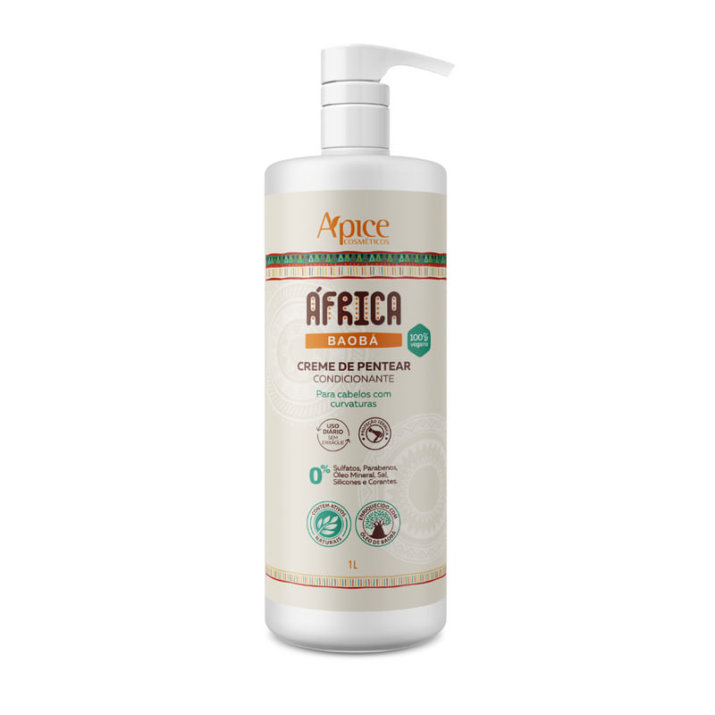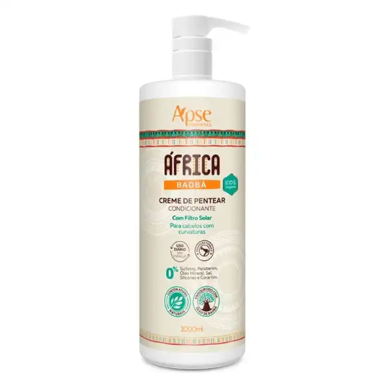 O Creme de Pentear Apse Cosmetics África Baobá proporciona brilho, maciez e vitalidade para suas madeixas. Sua fórmula especial destaca a curvatura natural dos fios, garantindo definição e controle para um visual impecável todos os dias. Cada aplicação é um mergulho em cuidado e nutrição, revelando a verdadeira beleza dos seus cabelos.*Produto livre de parabenos. Vegano e cruelty free.Conselho de Aplicação Após lavar e condicionar os cabelos com a linha África, aplique nos cabelos úmidos o creme de pentear com o auxílio de pente ou utilizando sua técnica de aplicação favorita. Não é necessário enxaguar. Nossos Experts Ensinam Para não comprometer a curvatura do seu cacho e evitar o frizz, prefira pentear os fios enquanto estiverem úmidos, sempre utilizando pentes de dentes largos ou uma escova anatômica de cerdas flexíveis. Ação / Resultado: Óleo de Baobá: por ser ricos em vitaminas, é absorvido pelo cabelo e assim, auxilia no brilho dos fios, protegendo-os da radiação solar, água do mar e do cloro da piscina. Também ajuda a manter as cores por mais tempo, pois previne o desbotamento. Rico em vitaminas A,D, E e F, hidrata e nutre os fios. Quando usado no comprimento do cabelo, ajuda a restaurá-lo, deixando-o mais saudável e, naturalmente, mais bonito. Kao Softcare GP-1: proteção térmica que retém a água na fibra capilar, formando uma película protetora. Cabelos suaves e sedosos, cheios de personalidade