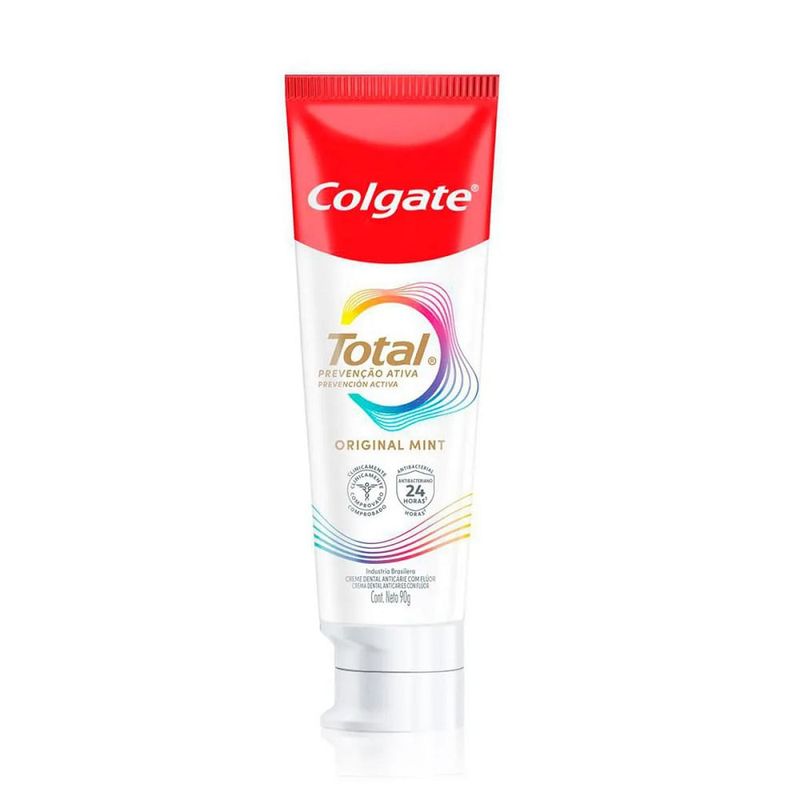 Creme Dental Colgate Total Prevenção Ativa Original Mint 4 Unidades 90g Cada Para que serve? O Creme Dental Colgate Total Prevenção Ativa Original Mint é ideal para quem busca proteção bucal completa e prolongada. Com fórmula avançada e 24 horas de proteção antibacteriana (com escovação 2 vezes ao dia e uso contínuo por 4 semanas), ele atua diretamente na causa raiz dos problemas bucais como mau hálito, cáries, placa, tártaro e erosão do esmalte. Enriquecido com flúor, proporciona limpeza profunda, alcançando até os locais mais difíceis, e garante um hálito fresco e duradouro. Como usar? Escove os dentes cuidadosamente, pelo menos duas vezes ao dia ou conforme orientação de seu dentista. Para crianças até 6 anos, utilize apenas uma quantidade equivalente ao tamanho de uma ervilha, sempre com supervisão de um adulto. Composição Contém flúor e ingredientes ativos com ação antibacteriana que ajudam a proteger dentes e gengivas, mantendo a saúde bucal em dia. Advertências Uso externo. Não ingerir. Crianças até 6 anos devem utilizar sob supervisão de um adulto. Em caso de irritação ou desconforto, suspenda o uso e procure orientação odontológica. Persistindo a sensibilidade por mais de 4 semanas, consulte seu dentista. Mantenha fora do alcance de crianças. Produto cosmético sem ação terapêutica. Principais Benefícios Proteção antibacteriana por até 24 horas* Previne cáries e fortalece o esmalte Combate mau hálito Reduz placa e tártaro Hálito fresco e sensação de limpeza prolongada *Com escovação 2 vezes ao dia e uso contínuo por 4 semanas.