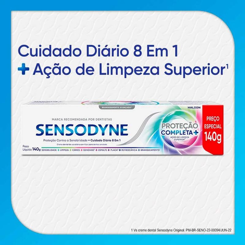 O que é a pasta de dente Sensodyne Proteção Completa e para que serve? A pasta de dente Sensodyne Proteção Completa é um creme dental de uso diário que oferece diversos benefícios para a saúde bucal. Com eficácia clinicamente comprovada, ela protege contra a sensibilidade dos dentes e proporciona um branqueamento avançado para um sorriso mais brilhante. Por que escolher Sensodyne Proteção Completa? Recomendada por dentistas, a Sensodyne Proteção Completa é a primeira pasta de dente com sílica esférica, proporcionando uma limpeza profunda sem agredir dentes sensíveis. Seu sabor mentolado refrescante com extratos naturais garante uma sensação de frescor e limpeza duradoura. Benefícios da pasta de dente Sensodyne Proteção Completa: Uso diário: Ideal para a rotina diária de cuidados bucais.Múltiplos benefícios: Promove a saúde integral da boca.Proteção contra sensibilidade: Alivia e protege dentes sensíveis.Eficácia comprovada: Clinicamente testada e aprovada.Sabor refrescante: Mentolado com toque de extratos naturais.Branqueamento avançado: Clareia os dentes eficazmente.Limpeza superior: Primeira com sílica esférica, não agride dentes sensíveis.Sensação de frescor: Sabor intenso que proporciona limpeza e refrescância.Cuidado 8 em 1: Abrange múltiplos aspectos da saúde bucal.Recomendada por dentistas: Confiada pelos profissionais.Como usar a pasta de dente Sensodyne Proteção Completa?Para obter os melhores resultados, escove seus dentes duas vezes ao dia, evitando engolir e sempre expelindo o produto após a escovação. Advertências importantes! Siga as instruções: Leia e siga sempre as orientações da embalagem.Dentes sensíveis: Podem indicar um problema sério que necessita de supervisão profissional.Sintomas persistentes: Se os sintomas não desaparecerem em quatro semanas, interrompa o uso e consulte um dentista.Irritação: Se ocorrer, suspenda o uso imediatamente.Evite ingestão: Não engula o produto.Uso infantil: Não use em crianças menores de 12 anos sem orientação médica.Inchaço: Se sentir inchaço na boca ou rosto, procure um dentista ou médico.Manter fora do alcance: Armazene fora do alcance das crianças.