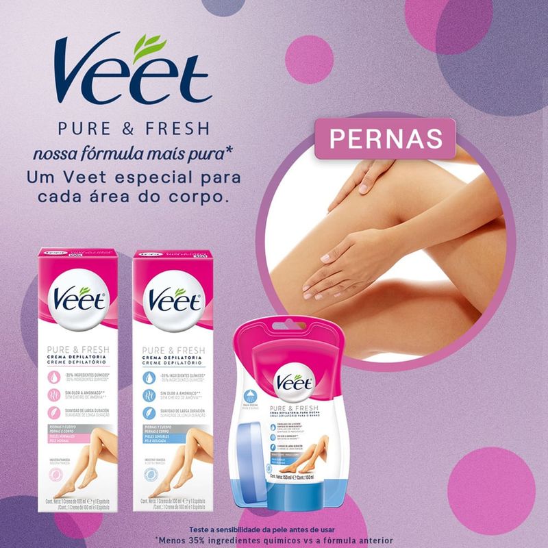 Creme Depilatório Corporal Veet Peles Normais 200ml Depilação eficiente com suavidade e pele hidratada! O Creme Depilatório Corporal Veet Pure & Fresh 200ml foi desenvolvido para peles normais, com fórmula mais pura e odor suave. Indicado para depilar pernas, braços, axilas e virilha, proporciona uma experiência prática e sem cortes, deixando a pele lisinha e macia por muito mais tempo³. Com ação próxima à raiz, o Veet Pure & Fresh remove até os pelos mais curtos em poucos minutos e oferece hidratação por até 24 horas. Dermatologicamente testado, é ideal para quem busca depilação sem dor ou coceira, com mais segurança e conforto no dia a dia. Benefícios Fórmula mais pura: com 35% menos ingredientes químicos comparado à fórmula anterior. Sem cheiro de amônia: aplicação mais agradável. Dermatologicamente testado: indicado para peles normais e seguras para pessoas a partir de 12 anos. Depilação eficiente: age próximo à raiz e remove pelos de até 1,5mm. Hidratação prolongada: pele macia e suave por até 24 horas. Prático e rápido: ação em apenas 3 a 6 minutos. Modo de Uso Com a parte curva da espátula, espalhe o creme Veet® até cobrir completamente os pelos. Enxágue as mãos imediatamente com água. Deixe o produto agir por 3 minutos cronometrados e use a espátula para remover uma pequena área de teste. Se os pelos saírem com facilidade, remova o restante. Caso contrário, deixe agir por mais 3 minutos, respeitando o tempo máximo de 6 minutos. Enxágue bem e seque a pele. Precauções e Advertências Uso externo. Não ingerir. Evite o contato com os olhos. Em caso de contato, enxágue com água abundante e consulte um médico. Não utilizar em pele irritada, lesionada ou com acne. Realize o teste de sensibilidade antes de cada uso. Produto indicado para maiores de 12 anos. Composição Água, Álcool Cetoestearílico, Tioglicolato de potássio, Petrolato líquido, Hidróxido de cálcio, Cetomacrogol 1000, Talco, Glicerol, Fragrância, Polietileno, Gliconato de sódio, Geraniol, Citronelol, Limoneno, Extrato do fruto de Cranberry, Extrato do pericarpo de Romã.