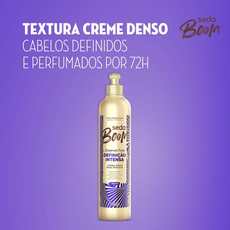 • O Creme para Pentear Seda Boom Definição Intensa possui exclusiva tecnologia ProCurvatura, que mantém os fios juntos e alinhados, ativando e memorizando a curvatura do cabelo por 72 horas • A fórmula desse creme para pentear é enriquecida com babosa, que promove maciez e brilho aos fios, e óleo de abacate, que nutre e dá resistência aos fios contra quebra • Creme para definição que ativa a curvatura dos seus cachos por 72h*, reduzindo seu volume e frizz, sem pesar • Este creme para pentear Seda Boom possui uma fragrância que garante 72h de cabelos perfumados por mais tempo • Esse creme para pentear é ideal para cabelos cacheados ou ondulados e é liberado, livre de petrolatos, parabenos, silicone e óleo mineral • O Creme para Pentear Seda Boom Definição Intensa deixa seu cabelo cacheado profundamente nutrido e com volume reduzido Seda Boom agora em nova embalagem, mas com a fórmula que você já conhece para eternizar seus cachos! O Creme para Pentear Seda Boom Definição Intensa possui tecnologia ProCurvatura, que mantém os fios juntos e alinhados, ativando e memorizando a sua definição por 72h*. Este creme é enriquecido com babosa, que promove maciez e brilho aos fios, e óleo de abacate, que nutre e dá resistência aos fios contra quebra. Esta fórmula vai deixar seus fios nutridos profundamente e com volume reduzido como eles merecem! Esse creme de cabelo é liberado, livre de petrolatos, parabenos, silicone e óleo mineral em sua composição. Com a Linha Seda Boom você escolhe seu creme para pentear de acordo com a finalização que deseja, afinal, sejam os seus cabelos cacheados, crespos ou ondulados, você é livre para se expressar como quiser. Dicas de finalização: 1. Com o cabelo úmido, divida-o em 4 partes e aplique o Creme para Pentear Seda Boom Definição Intensa. 2. Usando os dedos, separe o cabelo em pequenas fitas como se estivesse penteando. Amasse as fitas com as mãos em direção à raiz – cada fita formará um cacho! 3. Se na sua finalização você prefere ter cachos definidos com volume, você pode soltar os cachos com as mãos, pente garfo ou até mesmo com o secador! Dica Boom: você também pode utilizar a técnica dedoliss para uma definição estruturada. Para resultados mais incríveis use nosso shampoo, condicionador e máscara de tratamento de Seda Boom. Seda possui a certificação PETA, o que significa que não testa seus produtos em animais. *Conforme teste instrumental.