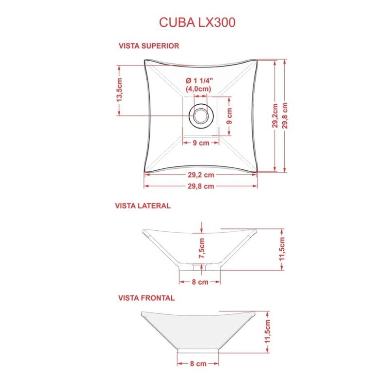 Seu banheiro de cara nova! Hoje, incrivelmente um dos locais da casa onde mais pedem decoração é o banheiro ou lavabo. Aqui apresentamos a você uma cuba elegante e de um escoamento de água excelente para proporcionar mais comodidade e versatilidade para os usuários do lavatório. Além de enriquecer o visual do seu banheiro, determina a funcionalidade do mesmo. Vale ressaltar que as torneiras mais indicadas para este tipo de cuba são as de parede ou de bica alta, e exige também uma bancada com espaço superior suficiente para abrigar a mesma, junto com os outros adornos de banheiro que você desejar. Ideal para fazer parte do seu sonho! Dimensões da Cuba (L x A x P) 29,8 x 11,5 x 29,8 cm Características: Estrutura em Mármore Sintético com acabamento Hard Lacca PU, semelhante a louça e responsável por criar mais resistência a peça. Acabamento Brilho. Furação da Cuba: Válvula Universal 11/4 (40mm). Formato: Quadrada. Modelo: Apoio Importante: O produto é enviado montado, requerendo apenas instalação por parte do cliente. Recomendação de Limpeza: Recomenda-se lavagem do produto com bucha apenas do lado amarelo e detergente neutro. Observações importantes: - Produto para uso residencial em ambiente interno, não devendo ficar exposto diretamente ao sol, calor e umidade excessivos. - Pode haver alguma diferença de tonalidade entre a imagem e o produto real, por conta do tratamento de imagens e a calibração de cores do seu monitor. - As imagens são meramente ilustrativas, não acompanham objetos de decoração e eletrônicos. - Ao receber a mercadoria, o cliente deve verificar as condições da embalagem, caso haja alguma avaria não assine o comprovante de recebimento. - Montagem, desmontagem e outras instalações serão de responsabilidade do cliente. Não nos responsabilizamos, no ato da entrega, por subir escadas/elevadores ou pelo transporte por guincho em apartamentos. Eventuais despesas são de responsabilidade do comprador. - Confira as dimensões do produto e certifique-se de que passará normalmente por supostos elevadores, portas, escadas e/ou corredores de sua residência.