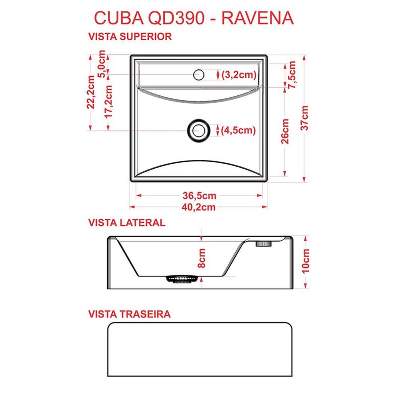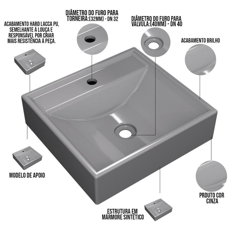 Seu banheiro de cara nova! Hoje, incrivelmente um dos locais da casa onde mais pedem decoração é o banheiro ou lavabo. Aqui apresentamos a você uma cuba elegante e de um escoamento de água excelente para proporcionar mais comodidade e versatilidade para os usuários do lavatório. Além de enriquecer o visual do seu banheiro, determina a funcionalidade do mesmo. Vale ressaltar que as torneiras mais indicadas para este tipo de cuba são as de parede ou de bica alta, e exige também uma bancada com espaço superior suficiente para abrigar a mesma, junto com os outros adornos de banheiro que você desejar. Ideal para fazer parte do seu sonho! Dimensões da Cuba (L x A x P) 40 x 10 x 37,5 cm Características: Estrutura em Mármore Sintético com acabamento Hard Lacca PU, semelhante a louça e responsável por criar mais resistência a peça. Acabamento Brilho. Furação da Cuba: Válvula Universal 7/8 (32mm) 11/4 (40mm). Formato: Quadrada. Modelo: Apoio. Importante: O produto é enviado montado, requerendo apenas instalação por parte do cliente. Recomendação de Limpeza: Recomenda-se lavagem do produto com bucha apenas do lado amarelo e detergente neutro. Observações importantes: - Produto para uso residencial em ambiente interno, não devendo ficar exposto diretamente ao sol, calor e umidade excessivos. - Pode haver alguma diferença de tonalidade entre a imagem e o produto real, por conta do tratamento de imagens e a calibração de cores do seu monitor. - As imagens são meramente ilustrativas, não acompanham objetos de decoração e eletrônicos. - Ao receber a mercadoria, o cliente deve verificar as condições da embalagem, caso haja alguma avaria não assine o comprovante de recebimento. - Montagem, desmontagem e outras instalações serão de responsabilidade do cliente. Não nos responsabilizamos, no ato da entrega, por subir escadas/elevadores ou pelo transporte por guincho em apartamentos. Eventuais despesas são de responsabilidade do comprador. - Confira as dimensões do produto e certifique-se de que passará normalmente por supostos elevadores, portas, escadas e/ou corredores de sua residência.