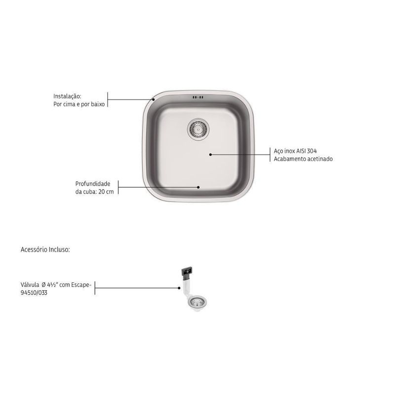 Cuba De Embutir Ou Sobrepor Tramontina Tramontina Aria Maxi 40 Bs Em Aço Inox Acetinado 40x40 CmCuba de Embutir ou Sobrepor Tramontina Aria Maxi 40 BS em Aço Inox Acetinado 40x40 cmA Cuba de Embutir ou Sobrepor Tramontina Aria Maxi 40 BS em Aço Inox Acetinado 40x40 cm é a escolha ideal para levar funcionalidade e beleza para sua cozinha! Produzida em aço inox com acabamento acetinado, ela pode ser instalada de maneira embutida ou como sobreposição, pois a cuba já possui borda de sobrepor para instalação por cima da bancada. Ela possui espessura de 0,8 milímetros e 20 centímetros de profundidade, características que garantem alta resistência, durabilidade e praticidade na hora de executar suas tarefas na cozinha! Produto comercializado no Brasil e exportação.Aço Inox AISI 304 com 0,8 mm de espessura e acabamento acetinado.Acompanha válvula de Ø 4 1/2 com escape.Profundidade da cuba 200 mm.Capacidade 28 L. Cor: Única | Peso Produto Com Embalagem (Kg): 2.4500000000000002 | Nome do Simples no Fornecedor: Cuba de Embutir ou Sobrepor Tramontina Tramontina Aria Maxi 40 BS em Aço Inox Acetinado 40x40 cm | Largura Produto Com Embalagem (cm): 46.5 | Produto precisa de Montagem?: Não | Comprimento do Produto (cm): 46 | Descrição do Tamanho: 46 x 26 x 3 cm | Estado de Origem: GO | Garantia em Meses: 3 | Comprimento Produto Com Embalagem (cm): 51 | Altura do Produto com Embalagem (cm): 31 | Material para Filtro: Inox | Instruções/Cuidados: Limpar com pano seco. | Conteúdo da Embalagem: 1 Produto - 1 Volume | Largura do Produto (cm): 46 | Peso do Produto (Kg): 2.25 | Altura do Produto (cm): 26 | CORES: Prateado | ColorFamily: Prateado | ColorSimple: Prateado | MaterialFamily: Inox