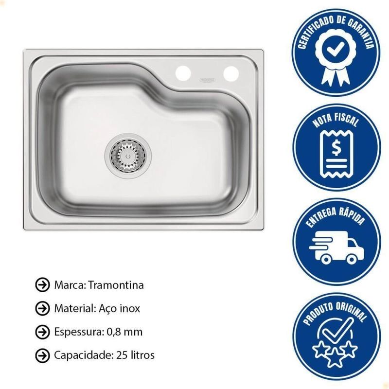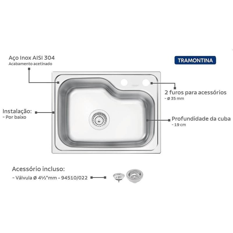 Cuba De Embutir Tramontina Morgana Compact 48 Fx Undermount Em Aço Inox 93815192- A Cuba Morgana Compact 48 FX Undermount da Tramontina combina design moderno com aproveitamento inteligente do espaço.- Fabricada em aço inox de alta qualidade, é resistente, fácil de limpar e perfeita para quem busca funcionalidade sem abrir mão do estilo.CUBA TRAMONTINA MORGANA COMPACT 48 FX UNDERMOUNT EM AÇO INOX 93815192Marca: TramontinaModelo: Morgana Compact 48 FX Undermount em aço inox 93815/192DESCRIÇÃO- Com a cuba Tramontina Morgana Compact 48 FX Undermount em aço inox você tem o item perfeito para completar sua cozinha e dar a ela todo o estilo e funcionalidade que merece.- Desenvolvida para cozinhas compactas, sua profundidade é de 19 cm e o furo para o dosador de sabão e misturador já estão acoplados.- Uma cuba resistente e funcional, essencial para projetos modernos e menores!CARACTERÍSTICAS- Instalação: Por baixo.- Cuba: Simples.- Capacidade: 25 L.- Material: Aço Inox AISI 304.- Espessura: 0,8 mm.- Acabamento: Acetinado.- Profundidade da cuba: 19 cm.- Furo para torneira: Sim, 2.-Acessórios inclusos: 1 Válvula 4 ½ e tampão para furo de torneira.RECOMENDAÇÕES DE USO- Remover a etiqueta colada na cuba. Limpar a pia com detergentes normais neutros. Usar somente esponja macia ou pano para lavar.- Esta peça contém bordas cortantes. Manusear com cuidado. Não usar ácido muriático, água sanitária ou qualquer outro solvente para lavar objetos.- Na reforma ou construção, proteger a pia para não deixar sobre a mesmo pó de cimento ou gesso. Enxaguar e secar bem a peça após o uso.- Nunca deixar objetos metálicos sobre a peça por períodos muito longos, para evitar a corrosão. Para manter o brilho, recomenda-se o uso da pasta para polir e remover manchas em superfícies de aço inoxidável Tramontina.PESO- 2,65 kgGARANTIA- 10 anos (90 dias de garantia legal acrescidos de 117 meses de garantia contratual) para vícios ou defeitos de fabricação. Termo de garantia disponível em Certificações/Normas.DIMNESÕES DO PRODUTO- Dimensões Produto (Compr. X Larg. X Alt.): 55 x 42 x 19 cm- Nicho para instalação: 52,2 X 39,2 cm.PERGUNTAS FREQUENTES:1. A cuba pode ser instalada por cima da bancada?Não. Este modelo possui instalação do tipo undermount, ou seja, por baixo da bancada, proporcionando um acabamento mais clean e discreto.2. A cuba já vem com furos para torneira e dosador de sabão?Sim. A peça já acompanha dois furos acoplados: um para o misturador/torneira e outro para o dosador de sabão.3. Qual é o tamanho necessário do nicho para instalação?O nicho recomendado para instalação é de 52,2 cm x 39,2 cm.4. A cuba é feita de qual material? Ela é resistente à corrosão?É fabricada em aço inox AISI 304 com acabamento acetinado, material de alta resistência à corrosão e ideal para uso em cozinhas.5. Acompanha quais acessórios?Acompanha 1 válvula 4 ½” e 1 tampão para furo de torneira, prontos para instalação imediata. Espessura: 0,8 mm | Certificações: 0 | Profundidade: 19 cm | ISBN: 0 | Cubagem: 0.153090 | EmbalagemComprimento-cm: 63 | Dias Entrega Fornecedor: 0 | Marca: Tramontina | Modelo: Retangular | EmbalagemAltura-cm: 45 | EmbalagemLargura-cm: 54 | Peso Líquido: 12.3000 | Linha: Morgana | Modelo alfanumérico: 93815192 | Material: Aço inox | Acabamento: Acetinado | Comprimento: 55 cm | Largura: 42 cm | Tipo de pia: Simples | Tipos de instalação: Embutir | Capacidade em volume: 25 L | Inclui torneira: Não | Com dosador de detergente: Não | Acessórios incluídos: Válvula, Tampão | Cor: Prateado | Tamanho: 55 x 42 x 19 cm | Itens inclusos: Não | Código certificação: 0 | Voltagem: 0 | Sabor: 0 | Certificado de Homologação da Anatel: 0 | Válvula para rápido esvaziamento: Sim