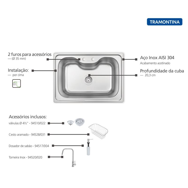 A Cuba de Sobrepor Tramontina Morgana 60 FX em Aço Inox com Acabamento Acetinado com Torneira, Válvula, Dosador de Sabão e Cesto aramado 68 x 48 cm vai dar uma cara nova à sua cozinha. Produzida em aço inox com acabamento acetinado, é um item super prático e versátil, pois é fácil de limpar e agrega requinte em todos os momentos do seu dia. Com os itens Tramontina você demonstra todo seu cuidado com o coração da sua casa!